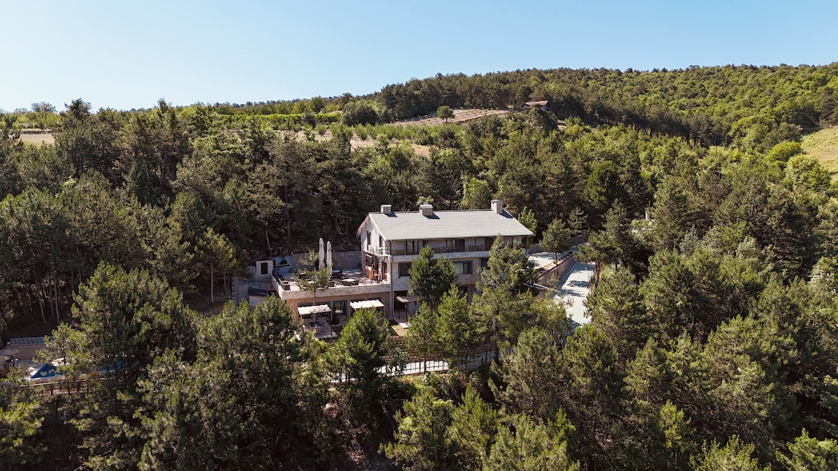 Mažas poilsio namelis su terasa, iš kurios atsiveria vaizdas į slėnį ir ežerą