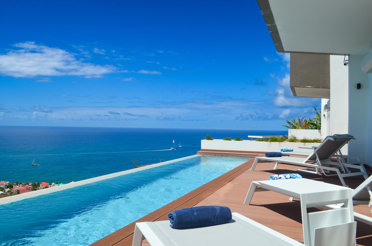 * 200 m² loftas * Išskirtiniai vaizdai į jūrą * Privatus baseinas * 250 metrų iki mažo paplūdimio Galisbay * Terasa su gultais, sodo baldai, sodo baldai, lauko stalas ir kepsninė * Rašomasis stalas * 100 Mbps Wi-Fi * Televizorius su tūkstančiais kanalų iš viso pasaulio * 250 m pėsčiomis iki Marina Fort Louis de Marigot * 5 min. pėsčiomis nuo Marigot miesto centro su restoranais, parduotuvėmis ir kitomis parduotuvėmis. * 5 min. kelio nuo prieplaukos iki St. Barts ir Angilijos bei taksi stoties