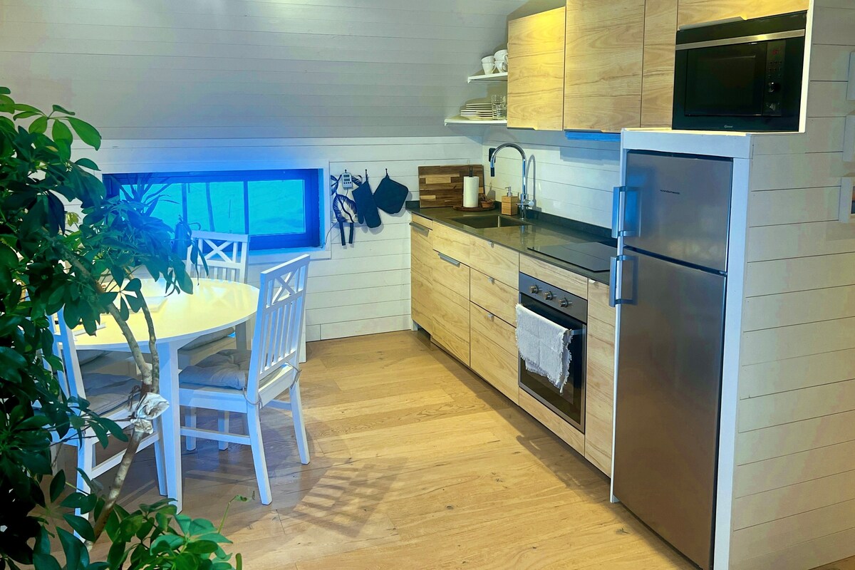 House (25 sqm). Private entrance, toilet, shower cabin & washing machine. The price includes bed linen, towels & final cleaning. One large room with a bed (140 cm), sofa (which can be used as a bed), desk. NO KITCHEN but there is a small refrigerator, micro & water boiler. As a hotel room - larger. Good storage and drying facilities. WIFI, TV with apple TV. Own part of patio. Not shoveled in winter. Parking space - by house. "Trixy" driveway up, due to road conditions.