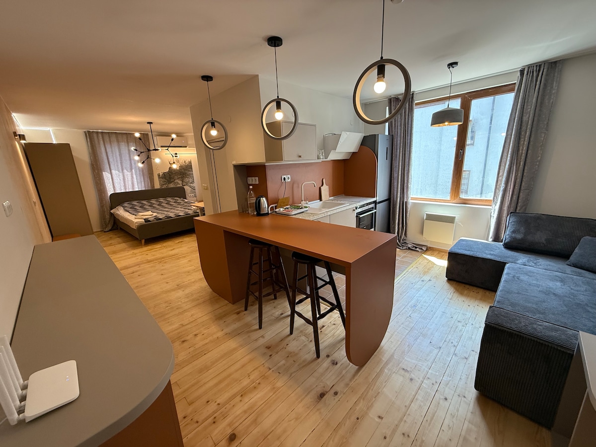 Sveiki atvykę į mūsų visiškai naujus prabangius butus Bansko, įsikūrusius kvapą gniaužiančioje Pirino kalnų grandinėje. Pasinerkite į unikalų urvų įkvėptą poilsį, papuoštą kaimiškais akmenimis ir šiltais medžio akcentais. Dvigulė lova žada maksimalų komfortą, o paslėpti LED šviestuvai sukuria stebuklingą atmosferą. Patirkite sklandų gamtos ir gausos derinį, su panoraminiais Bansko slidinėjimo kurorto vaizdais. Jūsų pabėgimas nuo kalnų laukia, kur kiekviena detalė šnabžda ramybę ir eleganciją