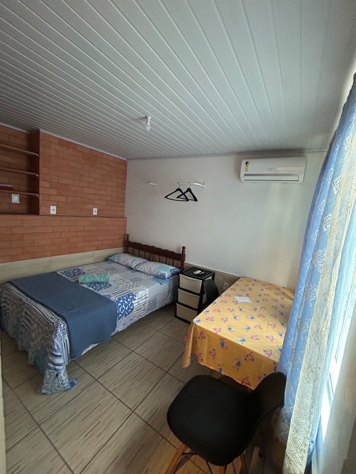 Butas/loftas Blumenau centre. Privatus garažas. Kondominiumas su liftu, prieškambaris. Privati, 1 dvigulė lova, pilna patalynė, antklodė, pagalvės. Virtuvė, mini baras, kavos aparatas, mikrobangų krosnelė, elektrinė viryklė, sumuštinių viryklė, maišytuvas, indai ir stalo įrankiai dviem asmenims. Oro kondicionierius, juodos užuolaidos, televizorius, plaukų džiovintuvas. Pilnas vonios kambarys su vonia ir veido rankšluosčiais. Namų biuro erdvė su 2 kėdėmis, 1 foteliu. Privatus Wi-Fi.