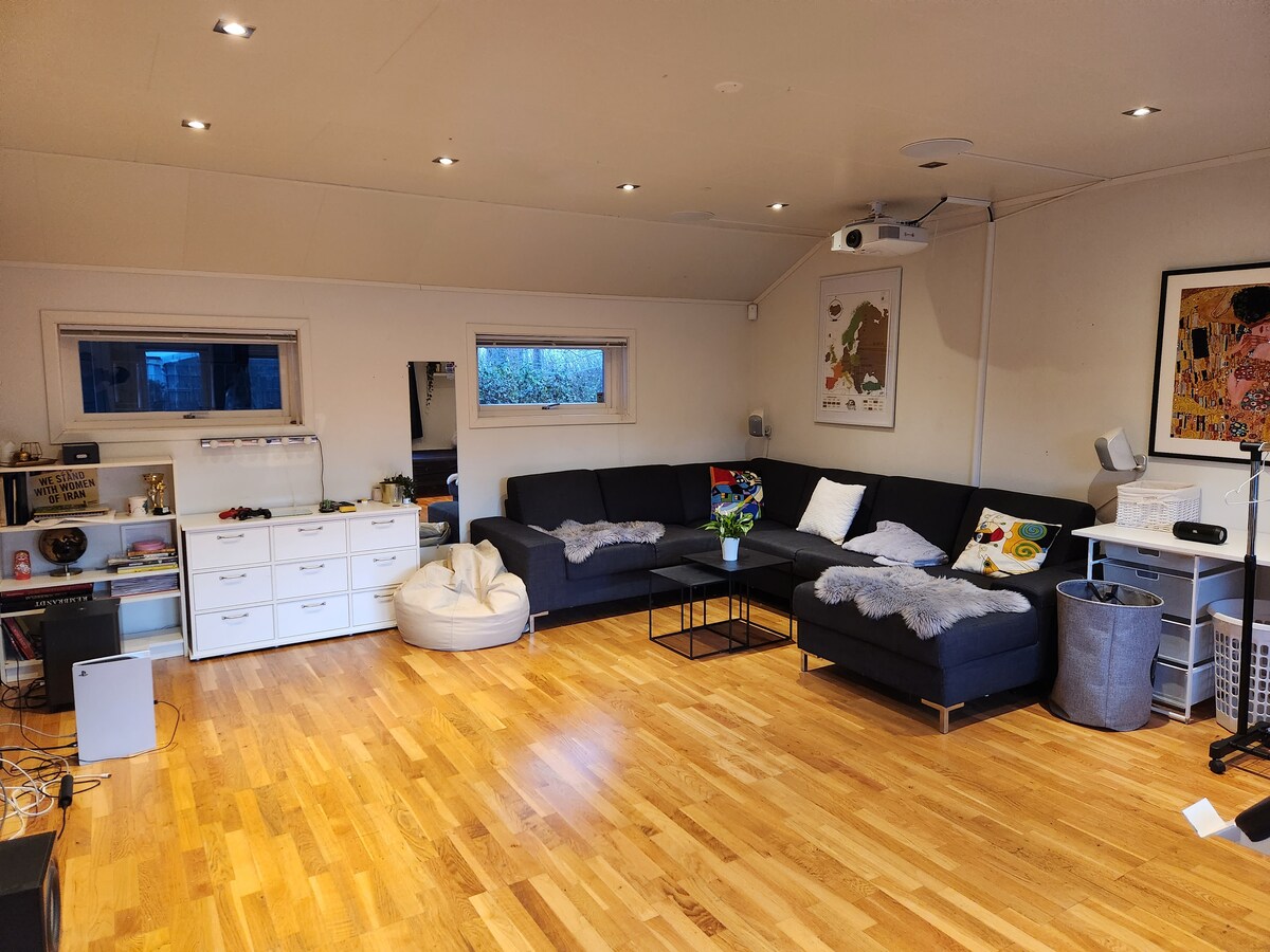 Šis namas yra ramiame rajone, už maždaug 15-20 minučių kelio pėsčiomis nuo miesto centro. Jei norite išeiti į gamtą arba į prekybos centrą, jis taip pat yra per 15-20 pėsčiomis. Namuose yra svetainė, virtuvė, 2 vonios kambariai ir 5 miegamieji su 7 lovomis. Prireikus galima parūpinti vaikišką lovelę. Du miegamieji yra papildomos svetainės su sofa, televizoriumi ir įvairiomis žaidimų konsolėmis bei treniruokliais. Čia yra didelis sodas su didele terasa su kepsnine, kuria galima naudotis.
