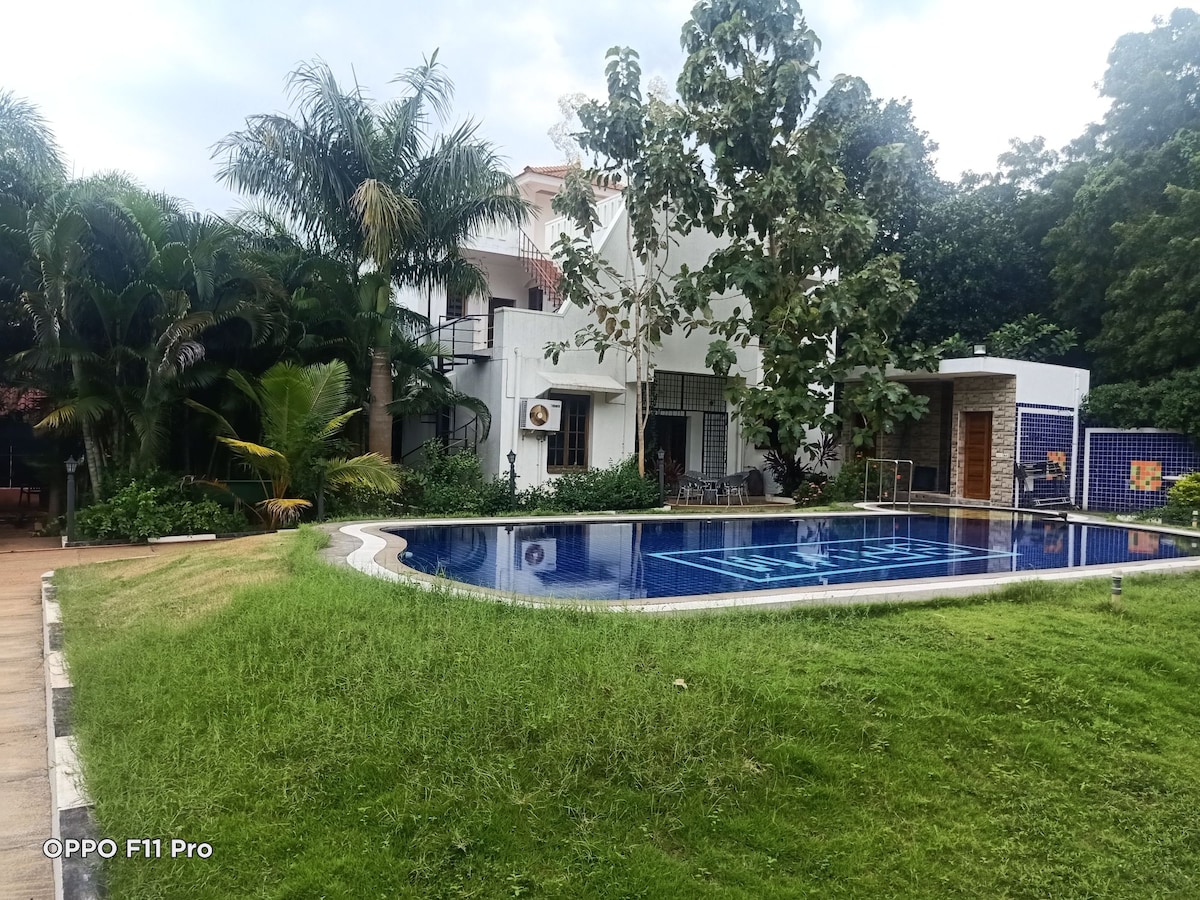 our property is 5bhk villa with swimming pool and spacious garden area.we located very close to Auroville beach.its like duplex style villas with 1room ,kitchen ,hall,2bathroom and dinning hall in ground floor.and in first floor 3rooms with attached rest room ,also balcony available.in second floor a spacious room with balcony area and restroom with bathtub. suitable for family groups corporate etc