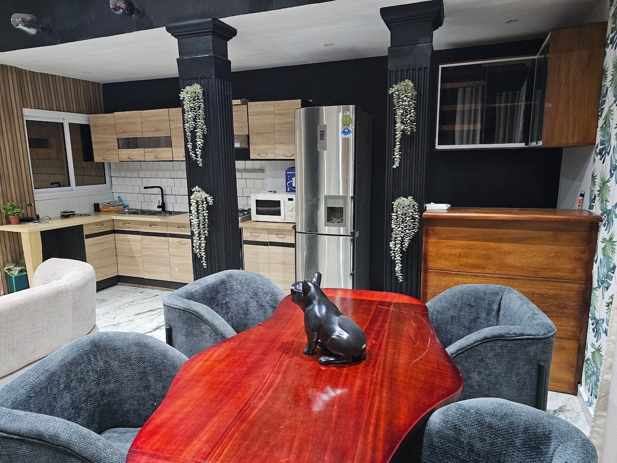 Atsipalaiduokite šiuose ramiuose ir stilinguose namuose. PRABANGUS BALDAIS APSTATYTAS BUTAS su amerikietiška virtuve, BCBG, PILNAS VARIANTAS, esantis pačioje Bonamoussadi-Dla širdyje, netoli restorano, Mandara turi saugią automobilių stovėjimo aikštelę ir absoliutų komfortą jūsų pamokoms ir ilgoms viešnagėms, svečių prašymu...
