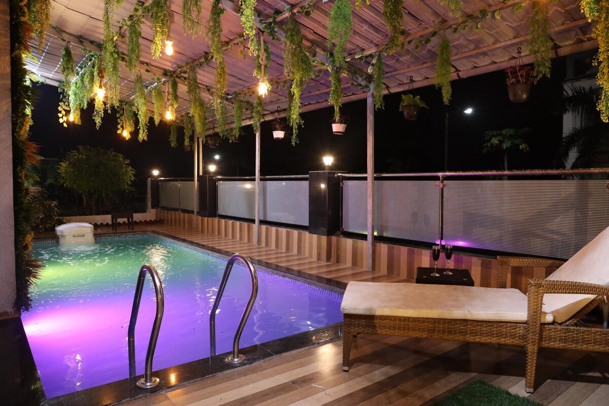 A luxurious 2-bedroom pool view villa located in Dahanu near Bordi beach. The villa features fully air-conditioned interiors, including a cozy living room with plush sofa seating and a relaxing sit-out area. Both bedrooms are spacious, equipped with king-size beds, TVs, and beautifully styled en-suite bathrooms with open to sunlight glass roof. Outdoors, guests can enjoy a large common swimming pool, a peaceful lawn, a poolside seating area and common dining area.