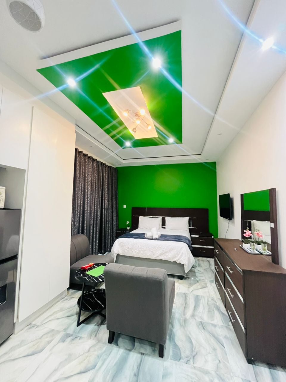 Spacious one bed apartment located at millennium heights in Borrowdale West. Close to all amenities with modern finishes, 24 hour security and free parking space. Safe and quiet neighbour hood. The apartment, is fully furnished & has back-up power . A lovely space to unwind and relax after a busy day whether it is work or leisure. Wifi is included. Secure gated community.