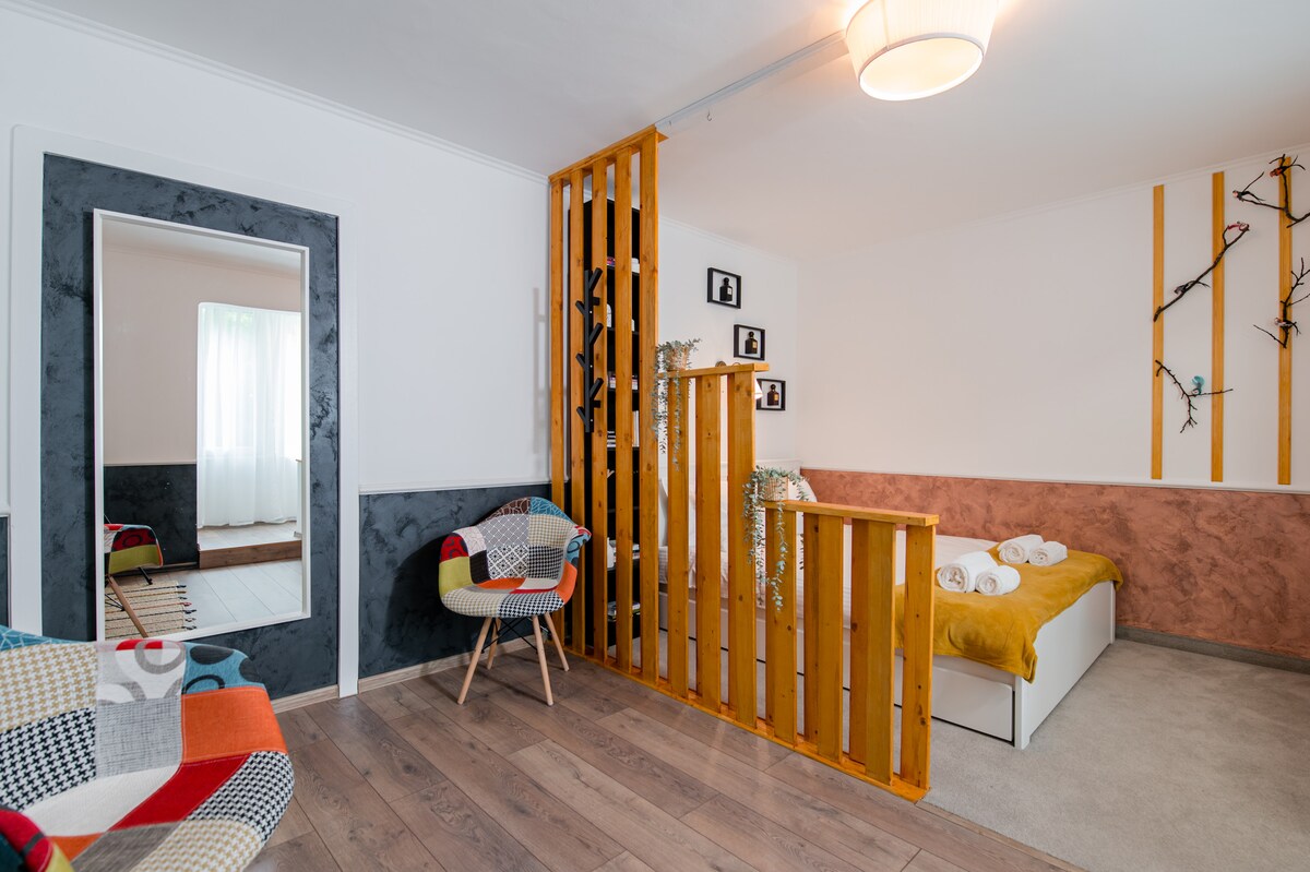 Pilnai įrengtas, labai šviesus butas yra už 10 minučių kelio pėsčiomis nuo miesto centro. Daugelis parduotuvių ir ūkininkų turgus yra vos už 3 minučių kelio. Miegamajame yra dvigulė lova (160 x 200), kurioje taip pat gali apsistoti 2 žmonės ir kūdikis. Svetainėje rasite išskleidžiamą sofą-lovą vienam/dviem asmenims, valgomojo erdvę ir darbo stalą. Galimas greitas ir nemokamas Wi-Fi. Butas yra antrame buto aukšte, saugioje ir ramioje vietoje.