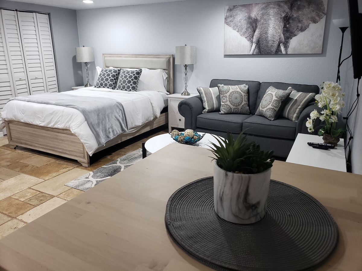 ŠI ERDVĖ SKIRTA TIK DVIEM SVEČIAMS. Gausite visą apartamentą. Su modernia atvira koncepcija šis apartamentas yra privatus ir patogus, idealiai tinka romantiškai išvykai arba tiesiog verslo kelionėms ar atostogoms. Atstumas pėsčiomis iki Seminole Hard Rock & Casino. Jame yra virtuvė, jauki dvigulė lova, vonios kambarys, 55colių televizorius (Roku), internetas (Wi-Fi) ir privatus įėjimas. Netoliese yra daug lankytinų vietų (Bush Garden, Adventure Island Parks, Downtown Town, Restaurants and Florida State Fairgrounds.