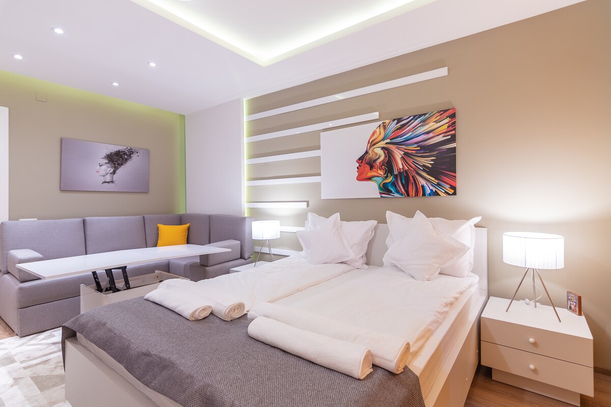 Bucură-te de confortul unei garsoniere în zonă centrală, amenajată cu grijă pentru ca tu să te simți "ca acasă, departe de casă". Situată într-o zonă liniștită, cu vedere spre parcare direct de la fereastră, această locuință oferă toate facilitățile necesare pentru o ședere plăcută, fie că vii pentru relaxare, muncă sau explorarea orașului. • Pat generos 160x200 cu saltea ortopedică • Aer condiționat • Smart TV • Wi-Fi • chicinetă: plită cu inducție, cuptor cu microunde, cafetieră, fierbător