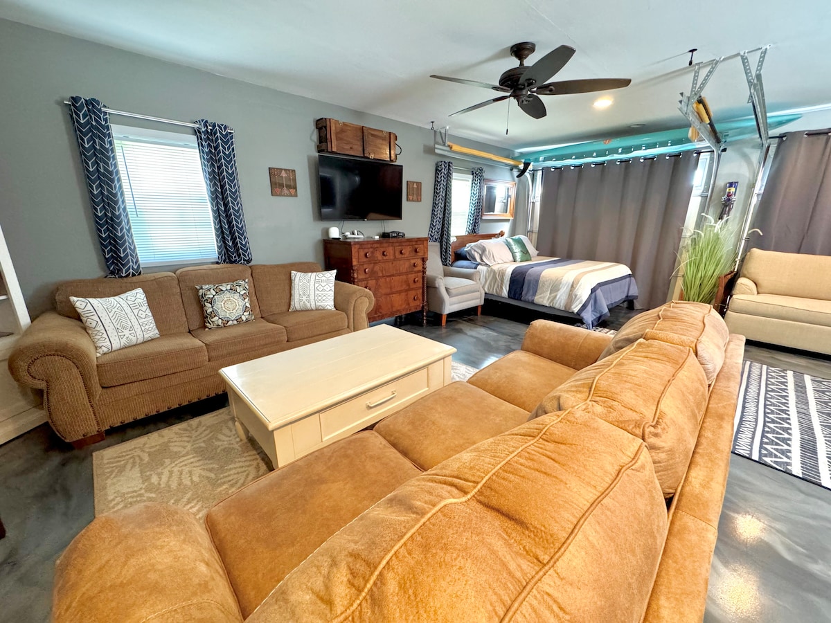 Skoningai dekoruotas atskiras studijos tipo butas privačiame aptvertame kieme vos už 2 kvartalų nuo paplūdimio! Puikiai tinka porai ar 2.. Mėgaukitės gamta ir grynu vandenyno oru sėdėdami gražiame baldų terasoje, prie tiki baro arba šalia laužavietės. Susirinkite prie stalų viduje arba lauke, kur yra daug sėdimų vietų. Studijoje yra puikūs patogumai, pradedant nuo didžiulio 82 colių išmaniojo 4K televizoriaus su erdviniu garsu, Wi-Fi ir Amazon Dot. Virtuvė su nerūdijančiaisiais prietaisais!