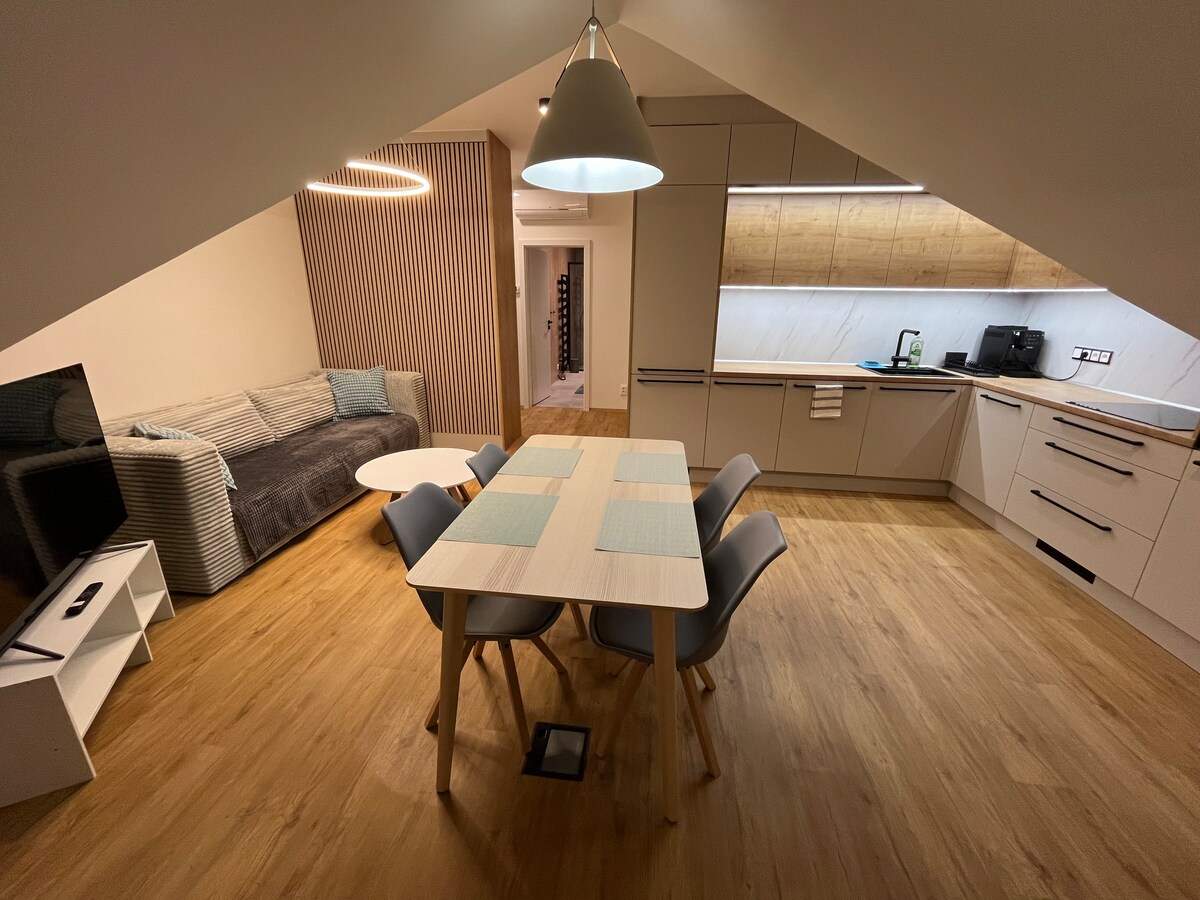 Jaukus butas, tinkamas dviem žmonėms. 3 aukštas iš 4 be lifto. Pilnai įrengtas pagal naujausius standartus - kavos virimo aparatas, skrudintuvas, indaplovė, skalbimo mašina, lyginimo lenta, plaukų džiovintuvas ir viskas, kas gali likti namuose:-). Rami vieta netoli miško, 30 minučių viešuoju transportu iki centro. Paprašius galima užsisakyti specialią automobilių stovėjimo aikštelę (ši paslauga jau įtraukta į apgyvendinimo kainą). Pailsėkite ir atsipalaiduokite šioje ramybės oazėje.