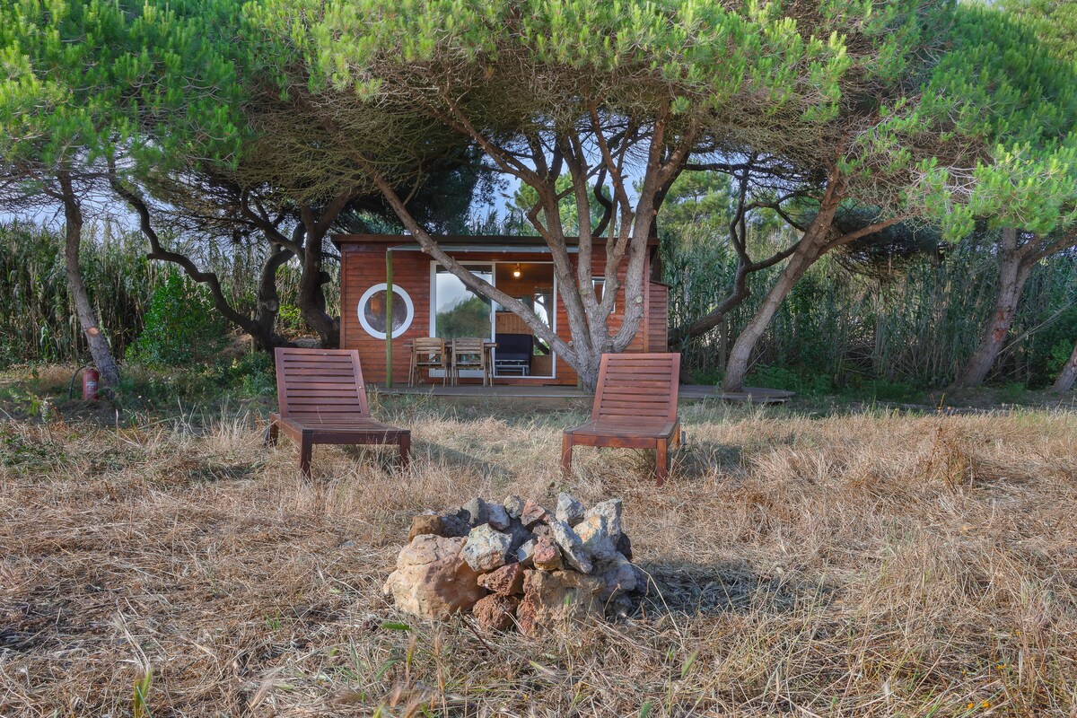 Beautiful wooden cabin, 2 min. walk from the ocean with amazing views. Our 6 hect. piece of land is part of Arrabida Natural park. The cabin has direct ocean views with magical sunsets. Beautiful beaches and a dramatic coastline offer great opportunities for hiking and outdoor activities. It has a double bed, comfortable mattress, fridge, gas stove and sun-deck. The outdoor hot water shower with view and compost toilet give you a perfect off-grid experience. Wilderness and nature are key!