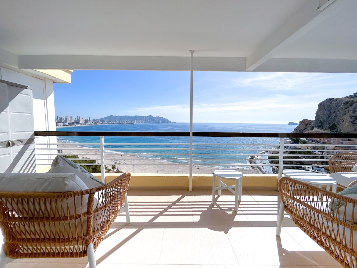 Apartamento con espectaculares vistas a 75 m de playa de la Cala de Finestrat (Benidorm). WiFi 600 Mb. Aire acondicionado en todas las estancias. Piscina, gimnasio, sauna, rodeado de restaurantes, comercios, supermercados, farmacia, mercadillo (martes y sábado). Bus y Taxi. Cocina: lavadora, horno, lavavajillas, microondas, cafetera, batidora, plancha, menaje completo, kit de bienvenida (botellas vino blanco y tinto). Baño con plato ducha, accesible, secador, amenities. Cuna bebé/trona gratuita.