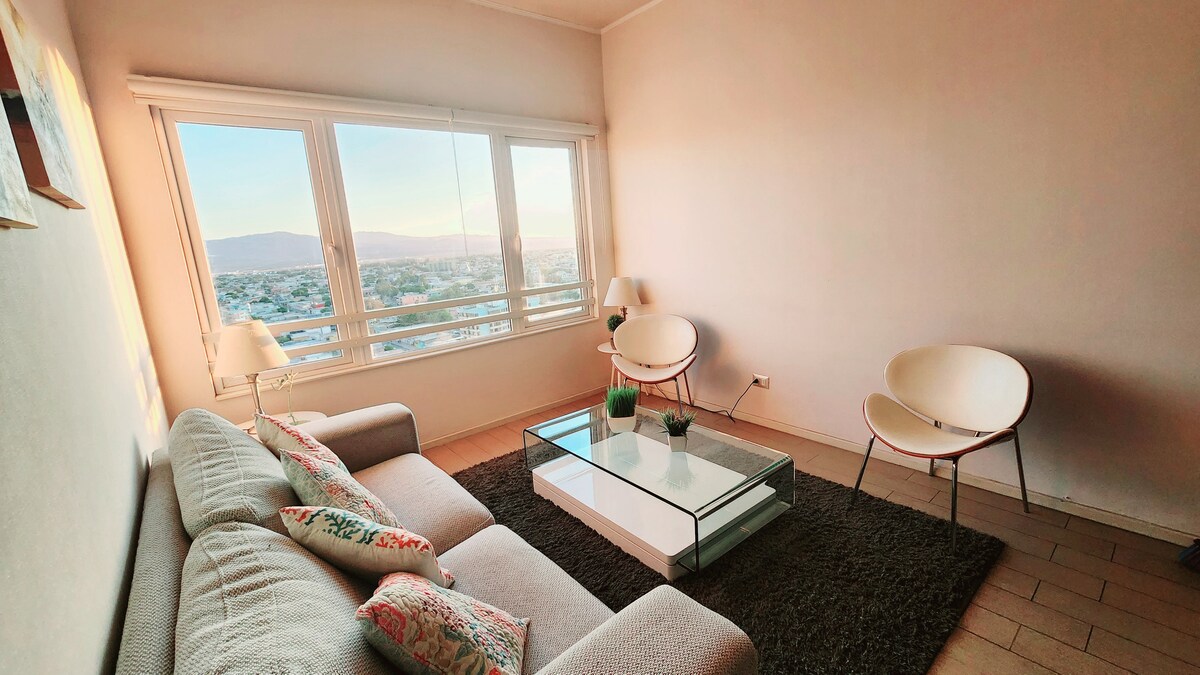 Departamento acogedor en piso 10, con excelente vista. Cuenta con 2 dormitorios estilo mariposa (cada uno con su baño privado), walk-in closet y estacionamiento privado. Ideal para familias, parejas o compañeros de viaje. Acceso seguro con conserjería y chapa digital para un check-in fácil y flexible.
