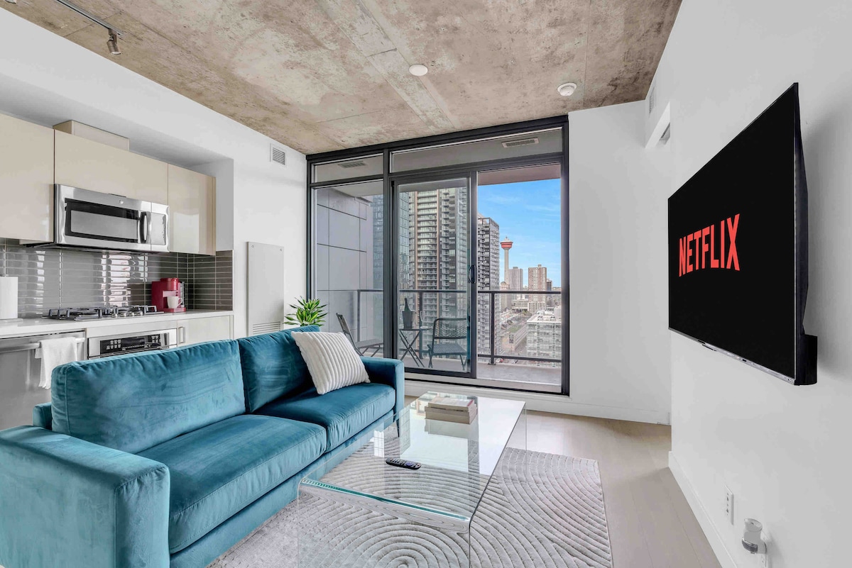 Šis 1 lovos butas su nuostabiais vaizdais yra pačioje miesto širdyje. Iki visko, ko norite, galite nueiti pėsčiomis per 15 min. ar net per trumpesnį miesto motorolerį. Ctrain taip pat yra už 5 minučių kelio pėsčiomis nuo likusios Didžiojo Kalgario dalies ir 300 autobusų, kurie važiuoja tiesiai į ir iš Kalgario oro uosto YYC. Atstumas pėsčiomis iki restoranų, barų, kazino, maisto prekių parduotuvių ir parkų. 2 val. kelio automobiliu iki Louise ežero, 1,5 val. iki Banff. Filmai, pasirodymai ir daugiau nei 5000 Nintendo žaidimų, kad būtumėte laimingi.