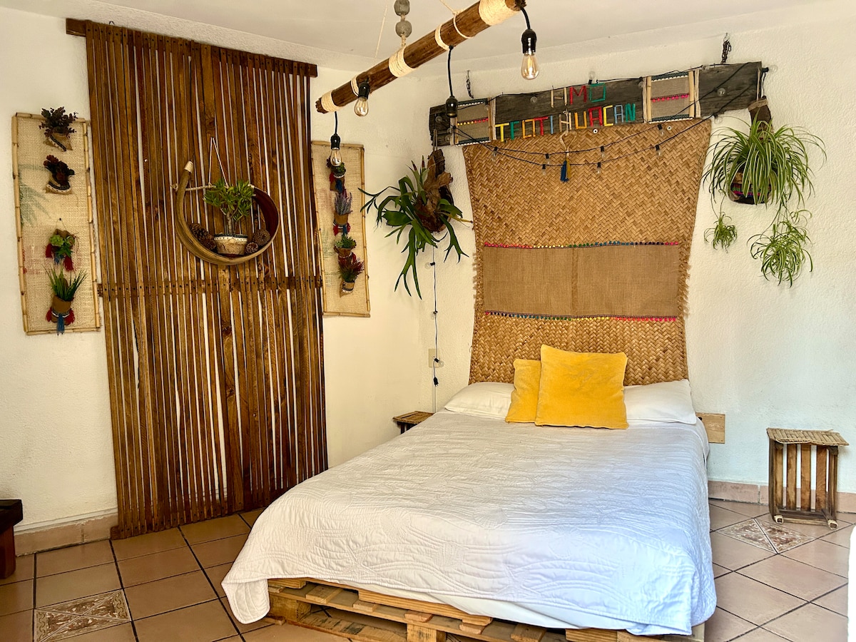 Gražus ir patogus butas viršutiniame aukšte, erdvus; labai arti Teotihuacano piramidžių. Jame yra 2 miegamieji, kuriuose gali apsistoti 4 svečiai, virtuvė, valgomasis, terasa, garažas ir sodas. Mielai jus priimsiu ir pasistengsiu, kad jūsų viešnagė Teotihuacane būtų maloni.