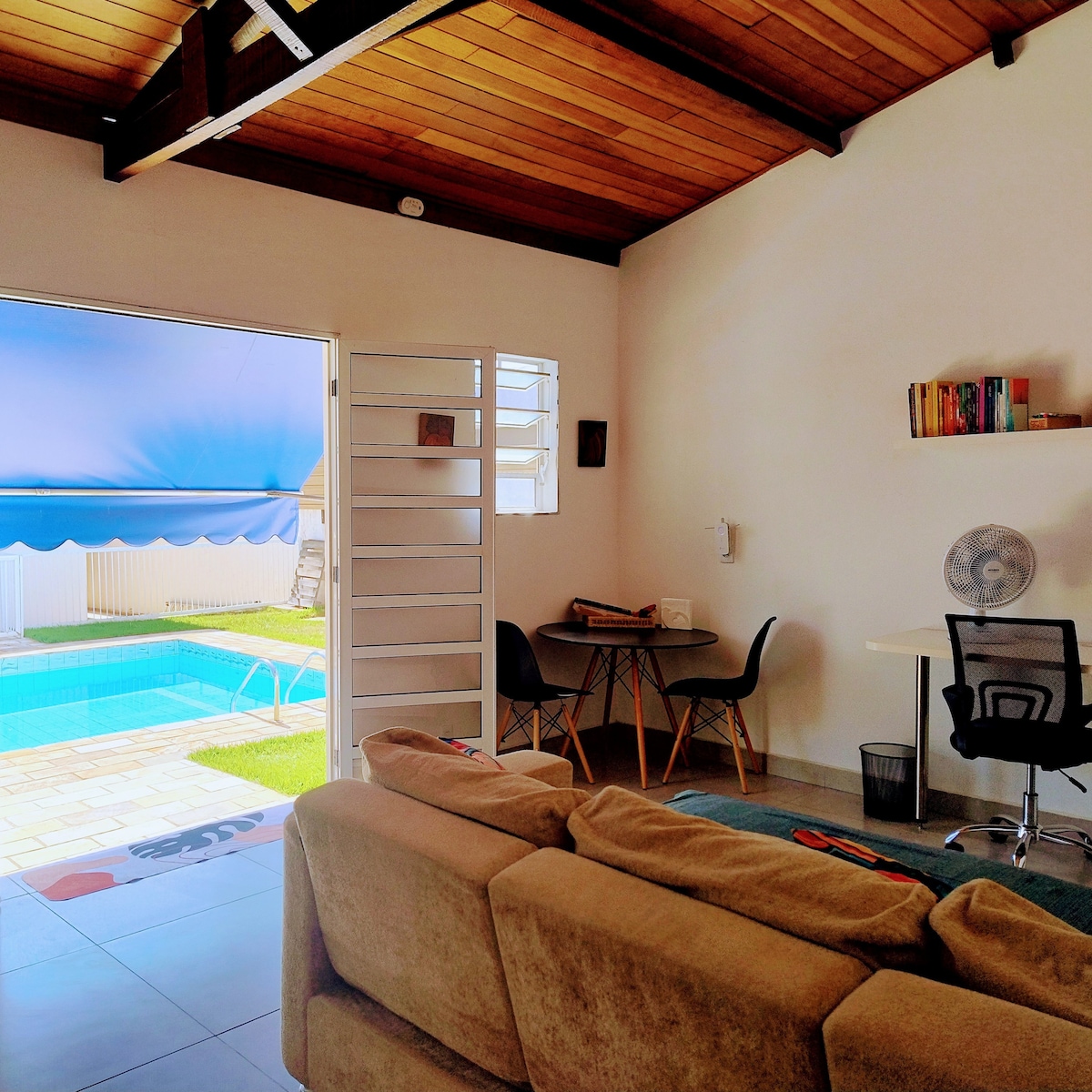 Guest house in the backyard of my home, detached, with its own entrance and private access to the swimming pool! - Refrigerator, microwave, mineral water, air fryer and electric kettle: coffee, cappuccino, tea and cheese bread for breakfast! - Double bed, ceiling fan, wardrobe - Reclining sofa, dining and work tables - TV with 120 channels + Netflix, Disney+, HBO Max, AppleTV and Globoplay - One parking space - Restaurants and shops within walking distance - Close to Lagoa do Taquaral