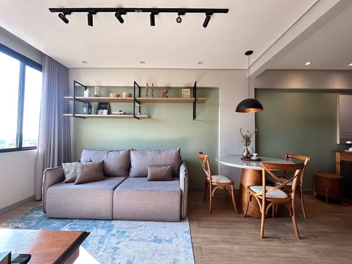 Apê moderno com ar-condicionado, varanda, cozinha completa e decoração de design. A 10 min do Cambuí, 15 min do Aeroporto de Viracopos, 6 min da Rodoviária e 5 min do Campinas Shopping. A uma quadra da Av. Amoreiras e do Parque Villa Garden, com supermercados, Oba, McDonald's, padarias, BRT, restaurantes e muito mais ao redor. Prédio com piscina, academia, rooftop, mini mercado 24h e academia Panobianco. Perto de tudo!