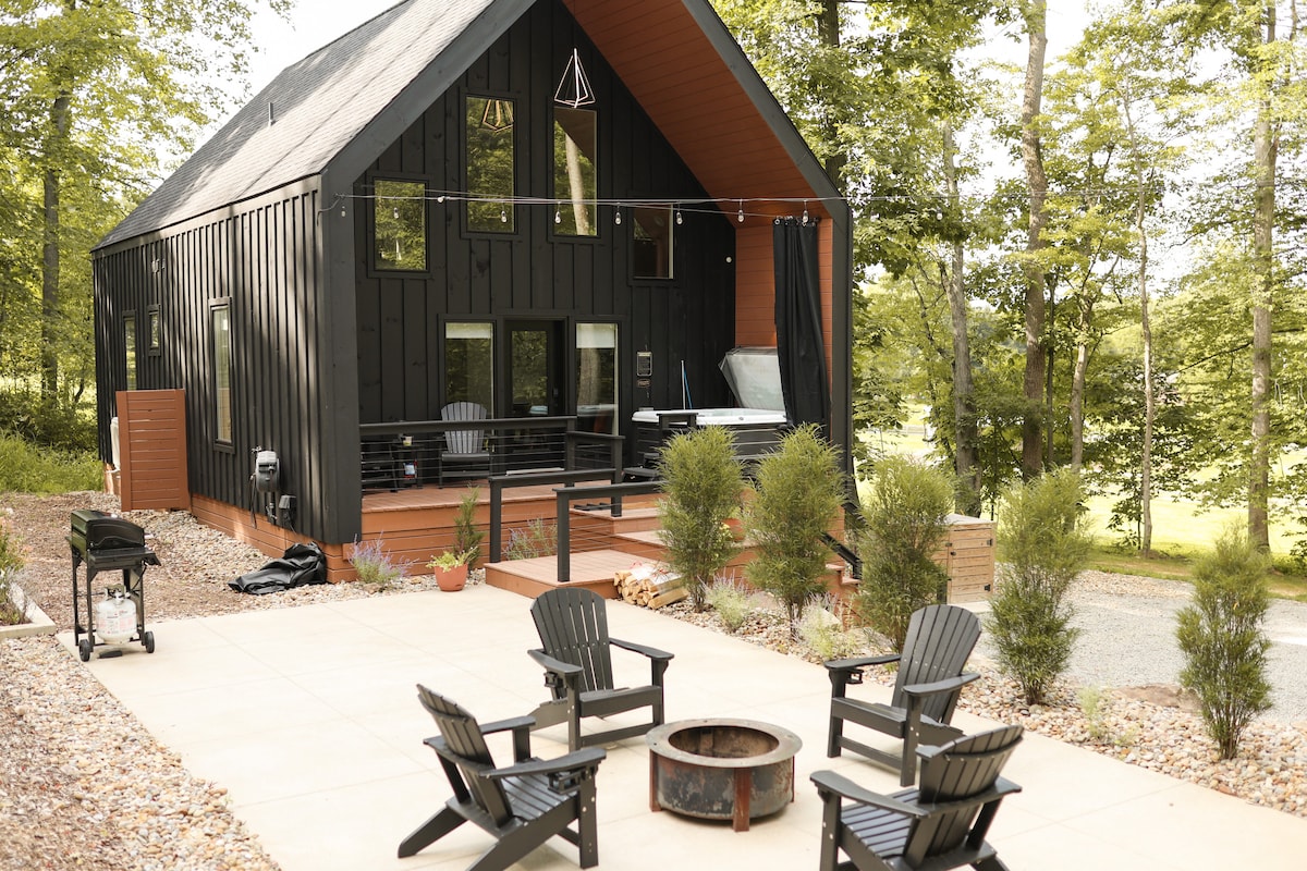The White Oak Cabin: Built in ‘22 •2 bed •2 bath •Hot Tub •Fully stocked kitchen •4 Electric Fireplaces •Living room - 50”TV •Climate control in each room ❄️ •Step ladder to loft In the loft: •Workspace •1 Huge Sectional-room for 2 •50” TV •Fireplace 30 minutes > Pro Football Hall of Fame 15 minutes > Sugarcreek (Amish Country) 20 minutes > 6 wineries 60min > Cuyahoga Valley National Park