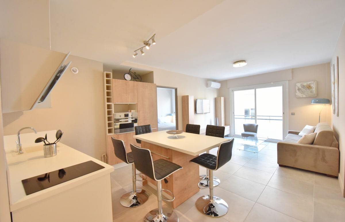 Magnifique appartement spacieux de 47m2 rénové entièrement avec des matériaux de qualité proche de tous les commerces et restaurants et situé à 14 min à pied (1km) du Palais des Festivals. Au 5ème étage avec ascenseur, ce deux pièces de 47 m2 vous séduira par sa rénovation moderne ainsi que sa terrasse au calme. La remise des clefs se fait dans un commerce de proximité (2 minutes à pieds) jusque 23h30. Passée cette heure un supplément de 20 euros sera demandé.