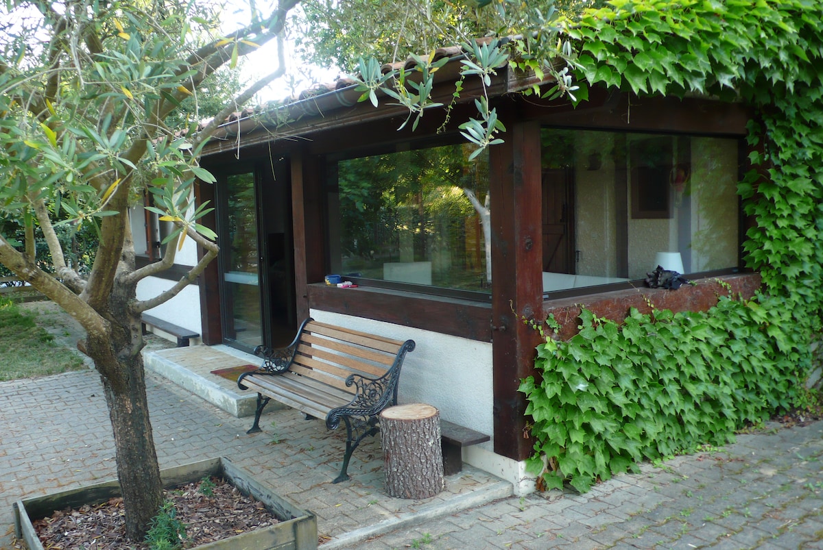 La "Guesthouse", dépendance de notre villa est située en lisière de forêt, sur une vaste propriété arborée de 15000m2 bordée par un ruisseau. Climatisée, équipée et décorée avec attention, la Guesthouse offre un confort moderne et élégant qui ravira les couples ou familles avec enfants. Elle est dotée d'un bain à remous pour se détendre. Une terrasse bois équipée d'un salon de jardin à l'année permet de profiter du moindre rayon de soleil !