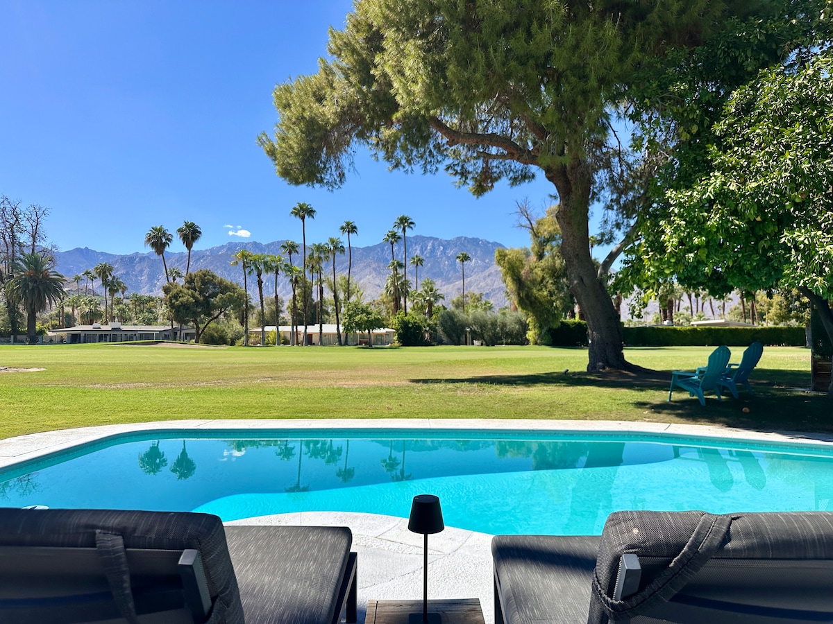 Before booking: Please enter the correct guest count and review all fees, rules, and policies. Max 8 adults + 2 kids. Experience Palm Springs like you're inside a nature park, where the sky opens wide and the land stretches endlessly. Here, the iconic San Jacinto Mountain rises in full view, framed by soaring palm trees that pepper the blue horizon and quiet, rolling fairways that resemble a vast meadow. Neighboring homes are distant and barely perceptible, allowing nature to take center stage.