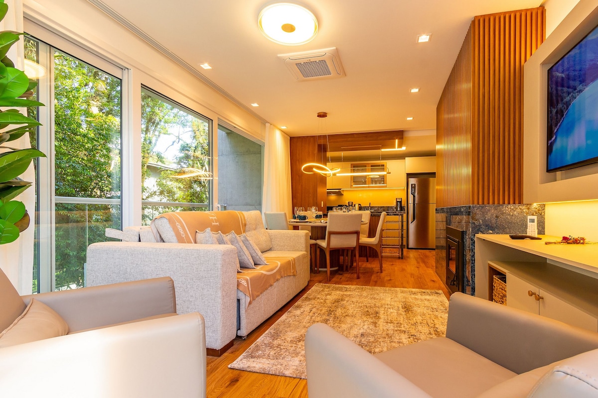 Localizado no luxuoso condomínio Vêneto concebido em estilo italiano, possui piscina aquecida, sauna e academia na área de lazer, este apartamento fica a 500m do Super Carros e a 4 min do centro de Gramado. Com uma ampla varanda da sala até o quarto, acomoda até 4 pessoas: 1 cama Queen + 1 auxiliar, e na sala um sofá cama. Possui ar-cond quente/frio em todos os ambientes, lareira ecológica, cozinha completa, churrasqueira, Smart TV na sala e quarto, vaga coberta, e com infra espetacular.