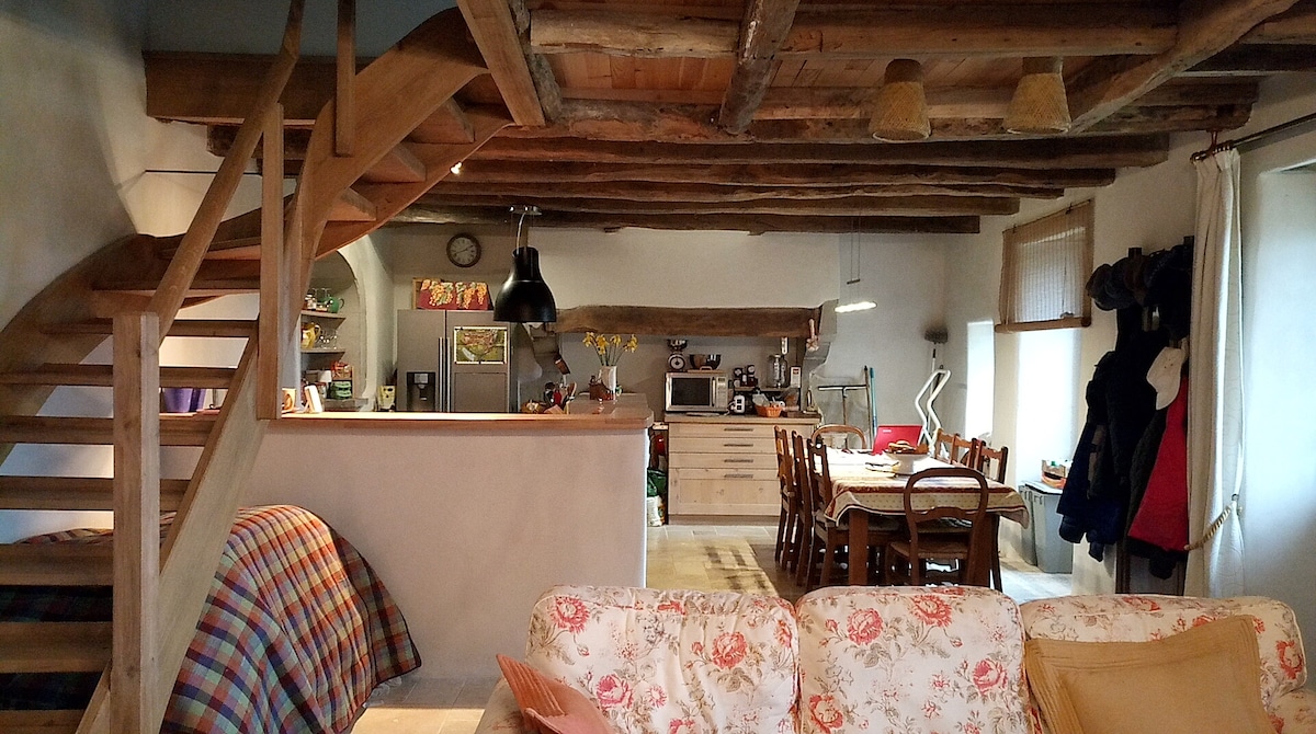 Namas, pastatytas 1970 m., visiškai renovuotas ir dekoruotas aštuntojo dešimtmečio stiliumi, iš kurio atsiveria plataus kampo vaizdas į stogus, bažnyčią ir jos bokštą, viduramžių bokštą ir pilies užpakalį žalioje aplinkoje. Nepamirškite. Tai taip pat terasų sodas, kuriame gyvena gėlės ir paukščiai, sodas, kuriame malonu skirti laiko, hamake, ant senovinio deginimosi arba prie stalo. Iki miesto centro, turgų, parduotuvių, barų ir restoranų galima nueiti per 5 minutes.