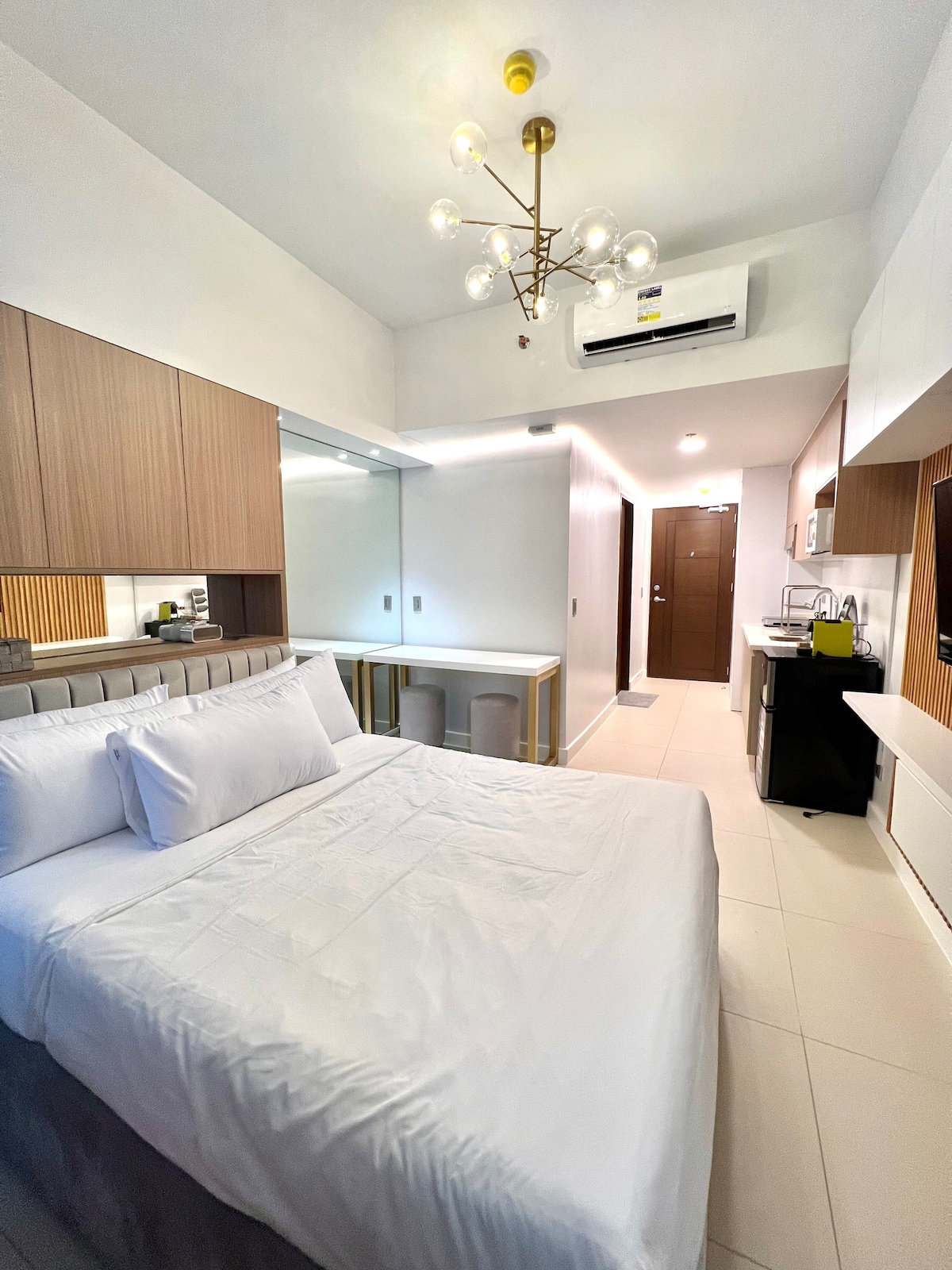 Sveiki atvykę į „The Amber Room“ - jaukų ir stilingą pabėgimą Cebu IT parke! Šioje studijoje su oro kondicionieriumi yra dvigulė lova, kabrioletas, greitas Wi-Fi, „Netflix“, darbo stalas, užtemdomos žaliuzės, karštas dušas, skalbyklė/džiovyklė ir virtuvėlė su šaldytuvu ir mikrobangų krosnele. Mėgaukitės prieiga prie baseino ir sporto salės bei eikite į kavines, bendro darbo erdves ir prekybos centrą „Ayala Mall“. Nesvarbu, verslo reikalais ar pertraukai, atsipalaiduokite, atgaukite jėgas ir patirkite Cebu kaip vietinis - iš erdvės, į kurią svečiai mėgsta grįžti.