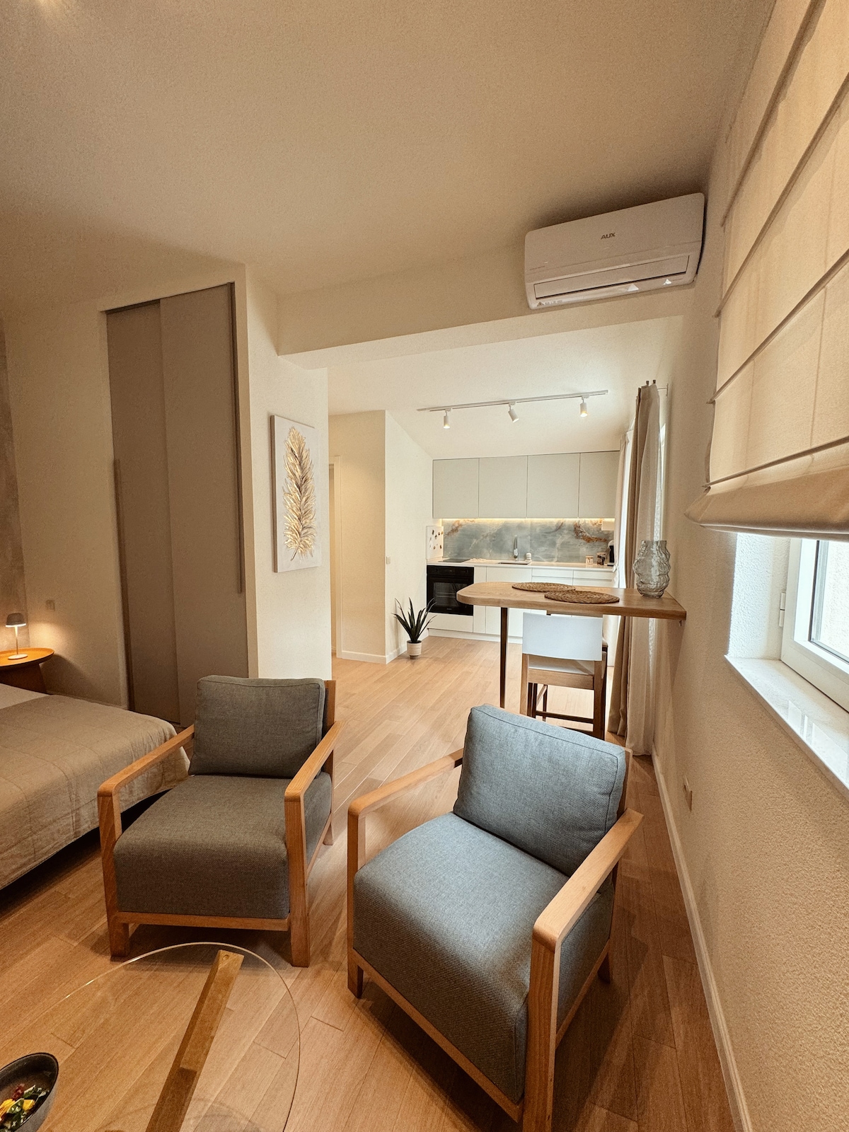 Šiuolaikinis studijos tipo butas, esantis prabangiame ir naujai pastatytame rajone, užtikrinančiame ramybę ir privatumą, vos už kelių minučių kelio nuo miesto centro. Apartamentai puikiai tinka poroms, pavieniams keliautojams ar verslo svečiams, ieškantiems komforto ir patogumo. Svečiai gali naudotis patogia lova, įrengta virtuve, moderniu vonios kambariu, didelės spartos belaidžiu internetu, oro kondicionieriumi ir išmaniuoju televizoriumi. Pastate yra parduotuvių, kavinių, restoranų ir sporto salės, o ramus rajonas garantuoja gerą poilsį.