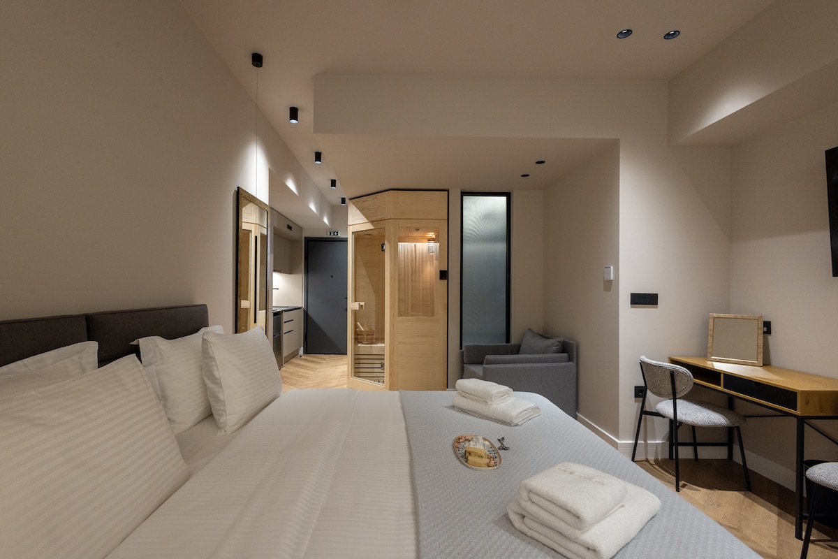 Sveiki atvykę į mūsų visiškai naujus prabangius apartamentus, kurie yra specialiai suprojektuoti, kad galėtumėte palepinti save ir kuriam laikui pabėgti nuo įtemptų kasdienio gyvenimo ritmų Erdvė yra 46 kvadratinių metrų, pilnai įrengta, kad atitiktų kiekvieno svečio poreikius Mėgaukitės idealo SPA ir hamamo trobelės sūkurine vonia, kuri yra erdvėje, mėgaukitės vandens šiluma ir pajuskite nuostabų jausmą, kurį siūlo naujoviška hidroterapijos sistema