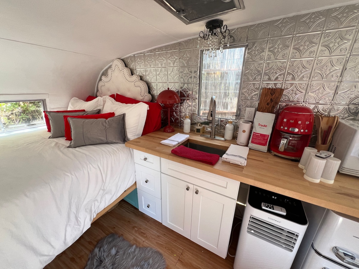 Intymi, apgalvotai suprojektuota erdvė poroms, ieškančioms romantiško pabėgimo. Šis išskirtinis „Airstream“ siūlo ikonišką stilių ir šiuolaikinį komfortą: pilno dydžio lovą, privatų vonios kambarį su karštu dušu, televizorių, valgomąjį ir oro gruzdintuvę, mikrobangų krosnelę, skrudintuvą ir trintuvą, kad galėtumėte mėgautis maistu. Atsipalaiduokite nuošalioje kiemo oazėje su lauko sėdimomis vietomis ir prabangia privačia sūkurine vonia (Jacuzzi J-LXL Spa) – puiki vieta atsipalaiduoti, romantiškiems vakarams po žvaigždėmis. Kalifornijos svajonė pildosi)