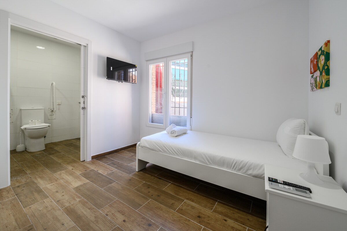 15 m2 kambarys su atskiru vonios kambariu, spinta ir stalu: tai mūsų siūlomas praktiškas ir patogus apgyvendinimas pavienėms kelionėms :) Esame Karabančelyje, pietvakarinėje vietovėje, netoli Madrido, už 50 min. kelio viešuoju transportu nuo miesto centro. Tai privati erdvė, kurioje yra koridorius su dar 5 kambariais, tačiau užtikrinanti maksimalų privatumą. Suorganizavome erdvę, kad ji būtų kuo jaukesnė su pagrindiniais dalykais (nėra virtuvės, paliekame kavos aparatą) :)