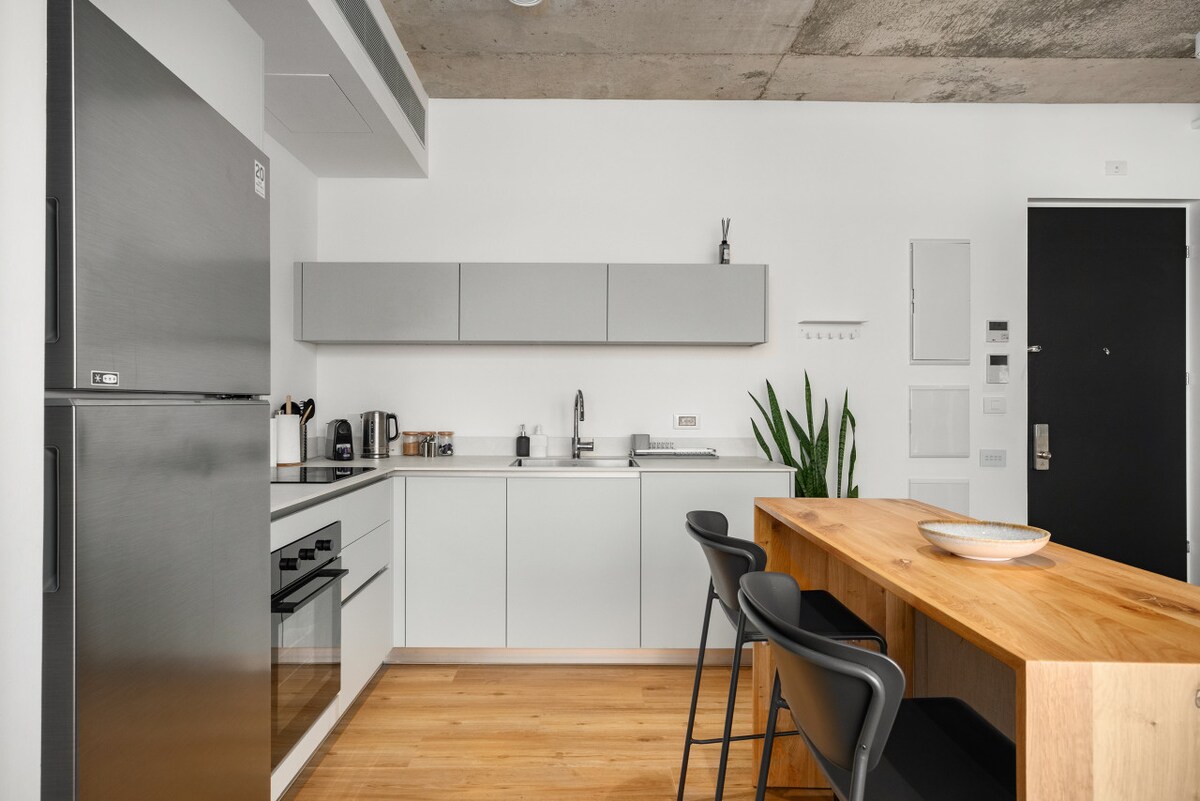 Sveiki atvykę į mūsų nuostabų renovuotą mansardą, esantį pačioje TLV širdyje, vos už kelių akimirkų nuo blizgančio paplūdimio. Šiame bute, esančiame kruopščiai išsaugoto Bauhaus pastato viršutiniame aukšte, siūlomas neprilygstamas istorinio žavesio ir modernumo derinys. rafinuotos elegancijos pasaulis, kai tik atidarote duris. Šio mansardinio namo interjero dizainas pagerbia Bauhaus stilių. Erdvus, atviras išplanavimas sukuria patrauklią atmosferą, puikiai tinkančią atsipalaidavimui ar pramogoms.