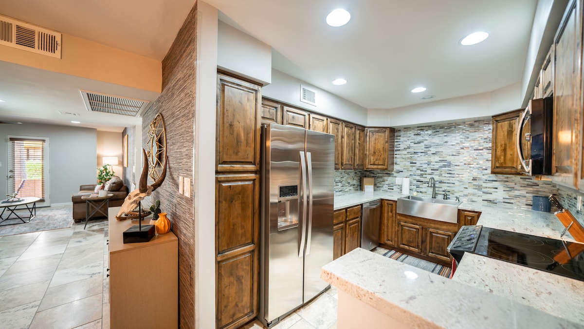 Sveiki atvykę į savo prašmatnią Sonoros dykumos oazę, kurioje susitinka stilius ir komfortas. Pradėkite dieną nuo kavos privačiame kieme, pasinaudokite dviem įtrauktais bilietais į Dykumų botanikos sodą ir atsipalaiduokite su rankų darbo gėrimu asmeniniame kokteilių bare. Ši centrinė poilsio vieta, kurioje yra dvi gyvenamosios erdvės, pilnai įrengta virtuvė ir speciali darbo vieta, puikiai tinka tiek atostogoms, tiek verslo viešnagėms. Augintiniai laukiami, o erdvus kiemas paruoštas jūsų keturkojams draugams.