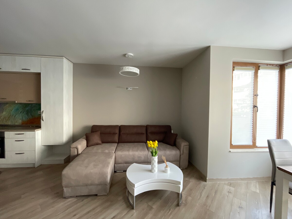 Sveiki atvykę į mūsų naują ir jaukų butą pajūryje! Apstatėme jį su didele meile, kad galėtumėte mėgautis išties atpalaiduojančia viešnage prie paplūdimio. Butas yra viename iš gražių Burgaso vartų kompleksų - Deimantinis paplūdimys, pirmoji linija iki jūros. Svečiai gali naudotis: • Lauko baseinas su vaikų zona • Poilsio zonas • kepsninės kampelį • Kraštovaizdžio parko zona • Visą parą veikianti apsauga ir vaizdo stebėjimas Baseinas Pirtis Garažas