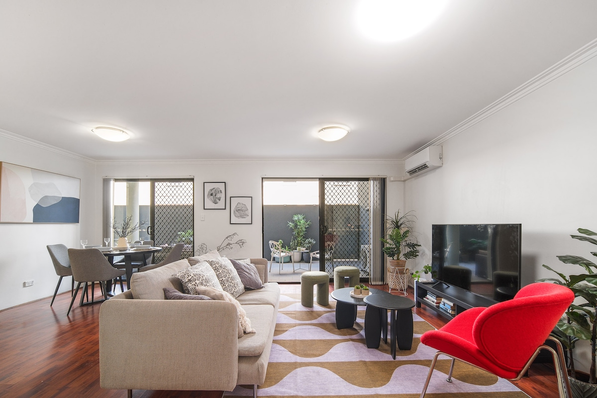 Mėgaukitės dideliu, stilingu ir gerai įrengtu butu, esančiu „vibe“ menininkų/studentų zonoje su netoliese esančia prieiga prie parduotuvių/restoranų/kavinių. Lengva nueiti iki pagrindinių Sidnėjaus CBD vietų netoli Unis ir Brodvėjaus su oro kondicionieriumi. Rytais į rytus atsuktas balkonas yra puikus, o iš atskiro miegamojo su dvigule lova taip pat yra privatus sodo kiemas. Saulės apšviesta pilnai įrengta virtuvė su naujais prietaisais ir kavos aparatu. Didelėje gyvenamojoje erdvėje yra Sony 55col. išmanusis televizorius ir Bose Bluetooth garsiakalbis.