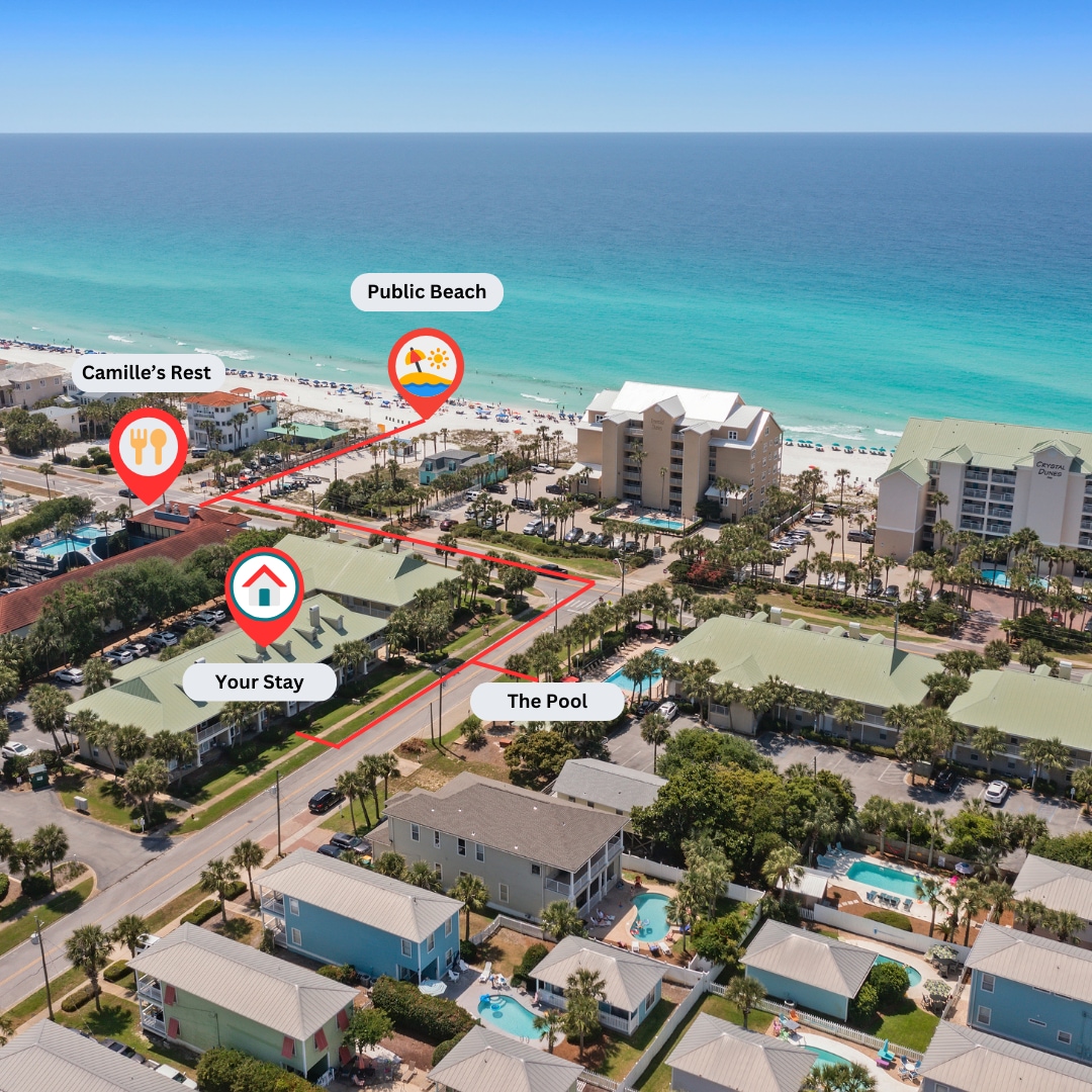 If you are looking for a beachfront townhouse with amazing views and a private beach, look no further than our center unit at Walton Dunes. We are located on a quiet, dead-end street next to Deer Lake State Park. Our complex of 17 townhouses completed an exterior upgrade in 2021 with new paint and railings. Our unit is in the center and was totally renovated by noted designer Ashley Gilbreath. New flooring and a master bathroom upgrade were done in 2023. Beachfront convenience awaits.