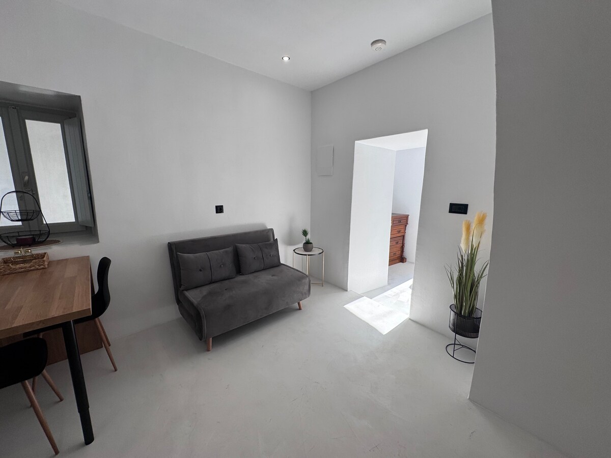 Sveiki atvykę į mūsų šviesią ir svetingą studiją, pastatytą gerbiant tradicinę Kikladų architektūrą. Baltos sienos, modernūs akcentai ir natūralios medžiagos sukuria ramią ir autentišką atmosferą. Studija yra miesto centre (naktį gali būti triukšmo). Studijoje yra: • Patogią dvigulę lovą • Pilnai įrengta virtuvėlė pusryčiams ar lengvam maistui ruošti • Skoningas vonios kambarys su tradicinio stiliaus dušu • Oro kondicionierius, TV ir Wi-Fi