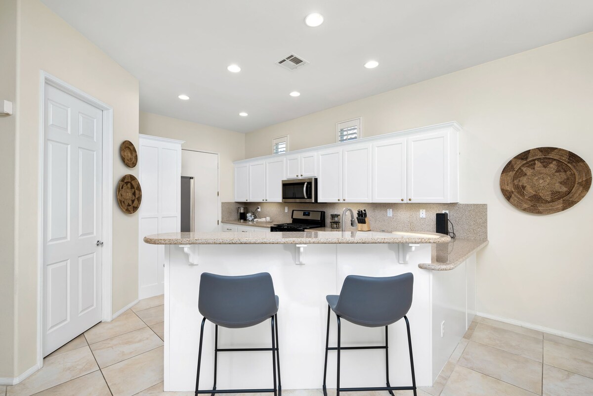Dykumos tematika 2bd 3ba plus den/ biuras. 1900 kv. pėdų. Įsikūręs Desert Falls Country Club. Visateisė prieiga prie baseinų, sporto salės, teniso ir marinato kamuoliukų aikštelių. 5 min. kelio iki naujosios Acrisure arenos ir netoli kelių kazino, puikių restoranų ir golfo aikštynų. Nauji baldai, išmaniosios televizijos, pilnai aprūpinta virtuvė, balkonas, žaidimų kambarys garaže su stalo teniso stalu, smiginio, krepšinio automatu, dviračiai vyrams ir moterims bei 3 elektriniai paspirtukai 🛴, „Pack N Play“, aukšta kėdė Augintiniai laukiami už papildomą 100 $ atvykimo metu
