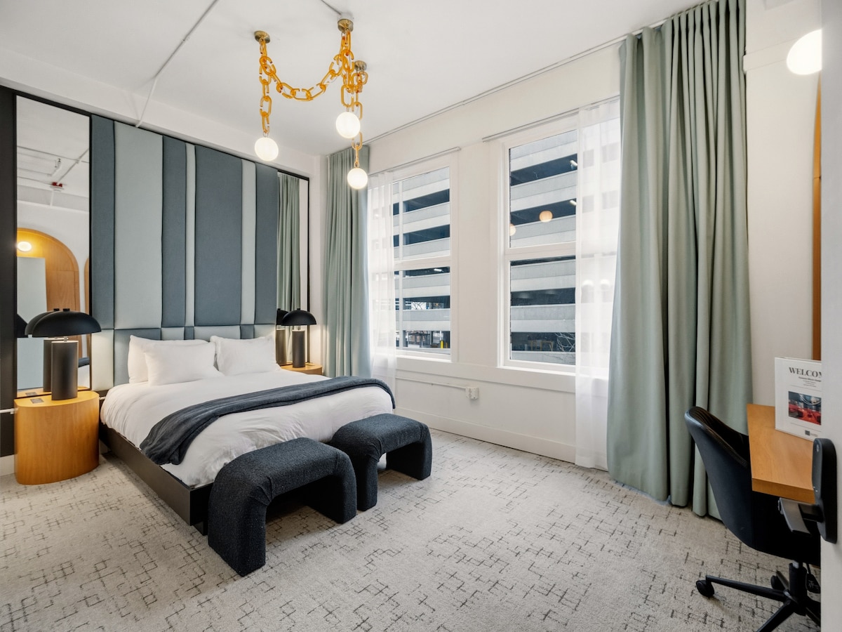 Mėgaukitės nauja viešnage šioje visiškai pertvarkytoje studijoje su moderniu dekoru ir apgalvotomis detalėmis. Erdvioje virtuvėlėje yra viryklė, mikrobangų krosnelė ir vidutinio dydžio šaldytuvas, todėl keliaujant lengva paruošti maistą. Atsipalaiduokite minkštoje karališko dydžio lovoje arba ant kušetės, ant kurios gali lengvai miegoti nedidelis suaugęs asmuo arba vaikas. Stilinga, patogi erdvė, kurioje susipina patogumas ir komfortas. Atkreipkite dėmesį: šis kambarys yra pakelės motelyje, todėl eismo triukšmas neišvengiamas!
