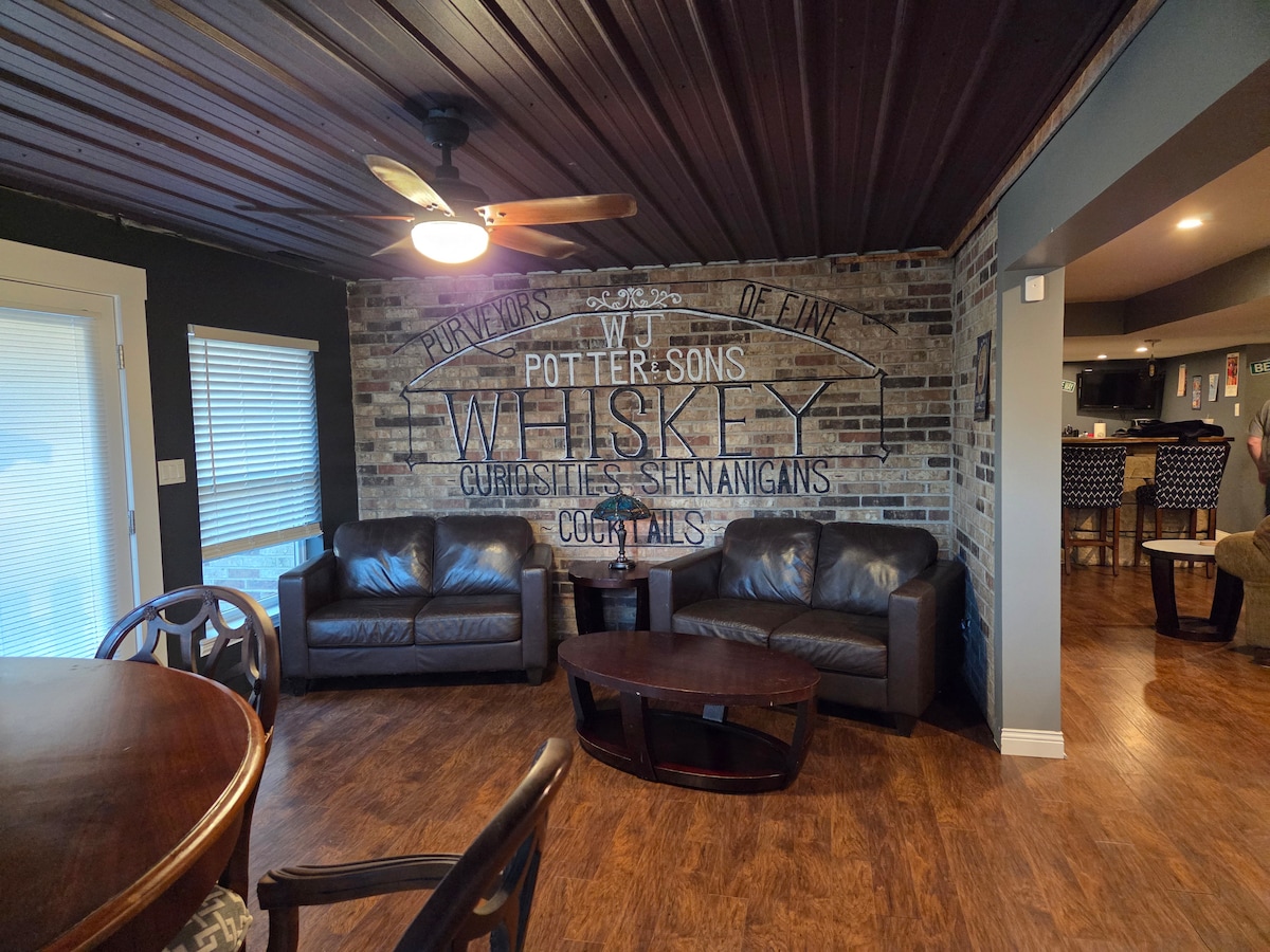 Visas žemesnis namų lygis su 2 gražiais dideliais miegamaisiais, erdviu vonios kambariu su daug karšto vandens duše! Gražus židinys nuostabioje svetainėje su valgomojo zona. Virtuvėlėje yra šaldytuvas, skrudinimo orkaitė, mikrobangų krosnelė ir Keurig kavos virimo aparatas Šis žemesnio lygio butas yra šviesus ir erdvus su dideliais langais kiekviename kambaryje! Miegamuosiuose yra televizoriai ir didelio ekrano televizorius gyvenamojoje erdvėje. Privati lauko poilsio zona su laužaviete, skirta mėgautis vakarais!