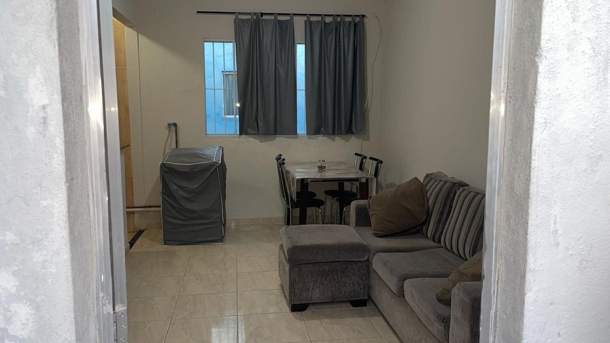 O espaço Acomoda até 5 hóspedes com conforto. 2 quartos: Quarto 1: cama de casal e ventilador Quarto 2: 2 cama de casal + guarda roupa + ventilador A Sala é convidativa e tem TV Smart para relaxar após um dia de trabalho ou passeio. A cozinha é equipada com o básico para as suas refeições. Cozinha equipada com todos os útensílios necessarios para a hóspedagem. 1 banheiro. 1 vaga de garagem. {OBS: apenas para carros pequeno\medio}. Próximo a varios comercios , lugar perfeito para descansar.