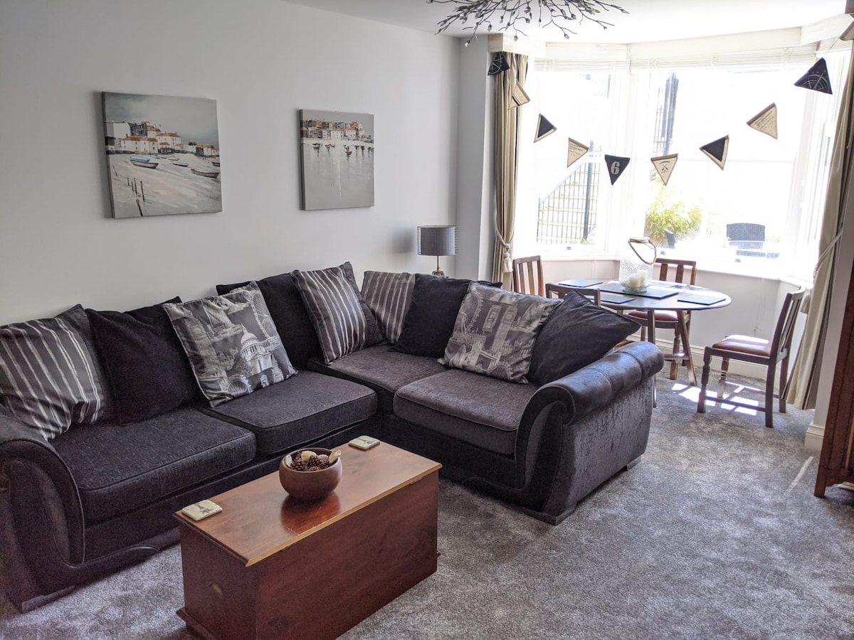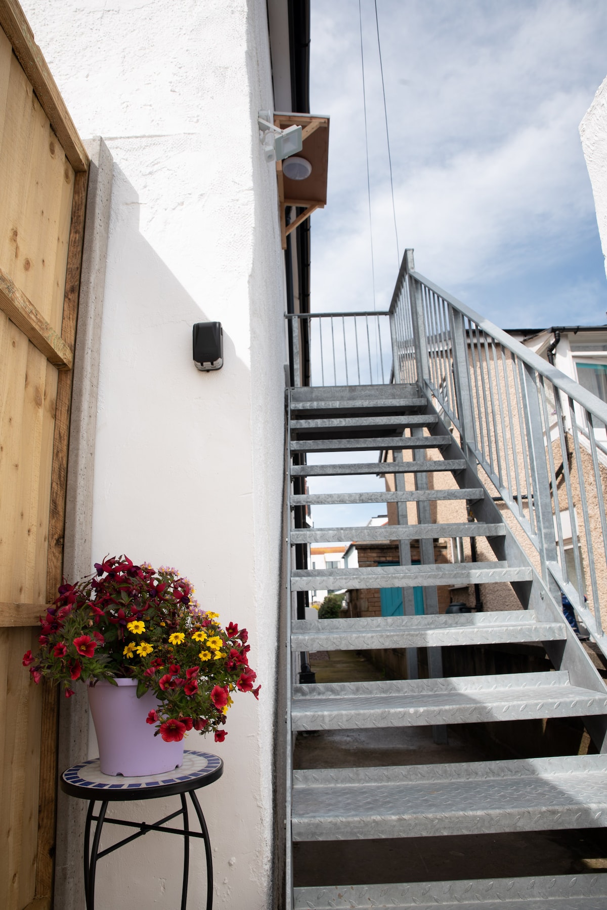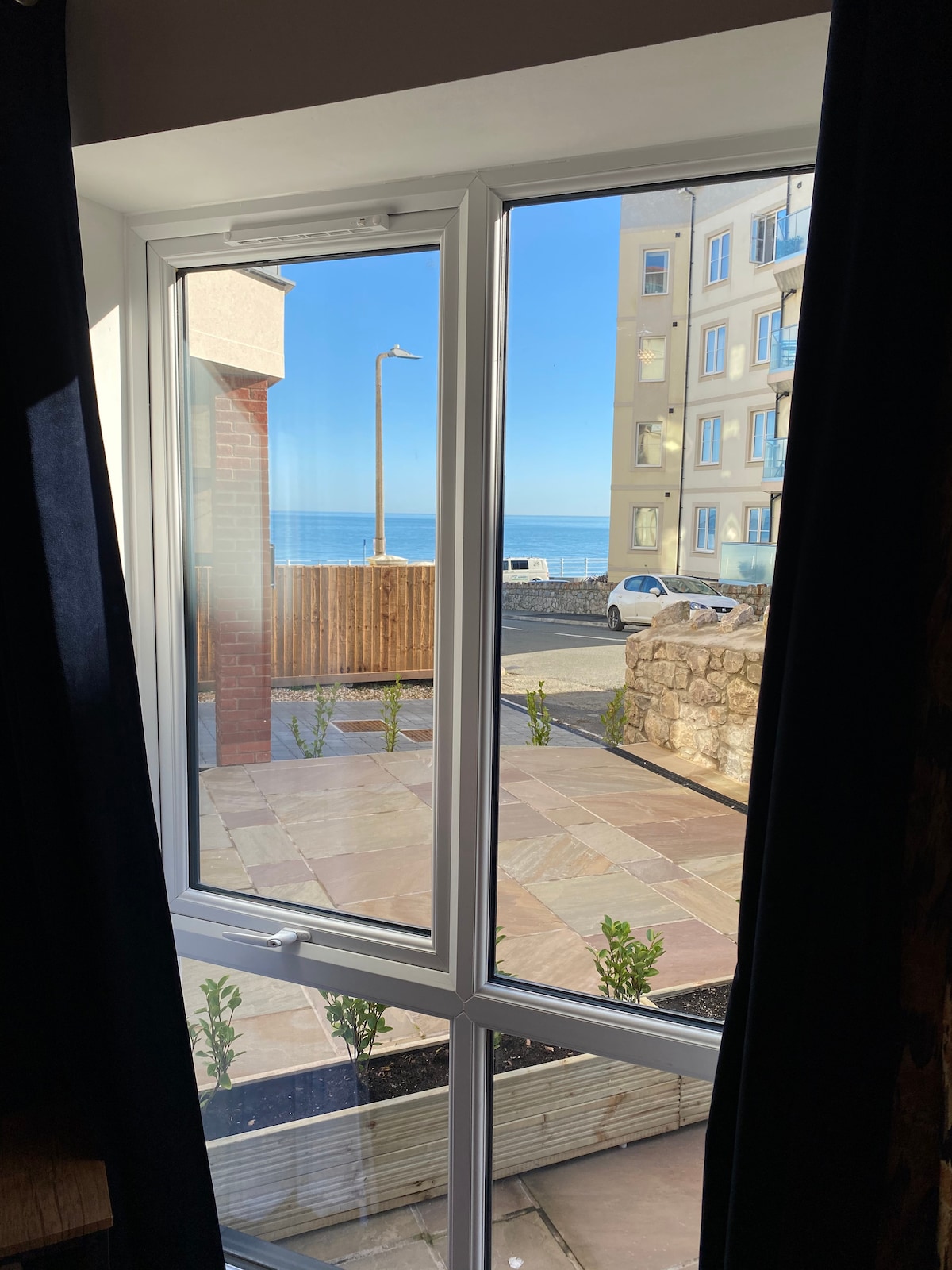 Welcome. The apartment provides both upstairs & downstairs accommodation with a 10 min walk down to or uphill from the beach, the station, the Wales Coastal Path & Deganwy village where several restaurants & cafes are located. The large room contains a double bed, 3 seater sofa (double bed), smart TV, a small breakfast table & 2 chairs with stairs down to a kitchenette & a washroom area. Patio doors lead onto a large balcony with views over the Conwy Estuary & towards Snowdonia & Anglesey.