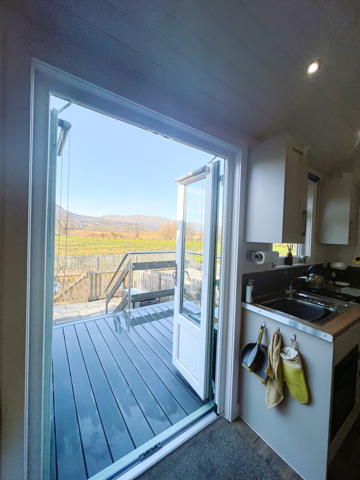 Mūsų rankų darbo prabangus namelis ant ratų yra ramioje mūsų XVII a. ūkio teritorijoje. Pabuskite paukščių giesmėse, gurkšnokite kavą prie tvenkinio, tyrinėkite sieninį sodą arba senovinį mišką ir pažvelkite po tamsiausiu dangumi Šiaurės Velse. Laukinės gėlės supa privačią lauko poilsio zoną ir su žavingomis paveldo detalėmis, ši jauki poilsiavietė sujungia komfortą su kaimo ramybe. Susipažinkite su mūsų draugiškais ūkio gyvūnais ir mėgaukitės lėto gyvenimo mūsų šeštos kartos kalvos ūkyje skoniu