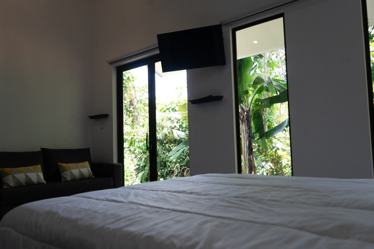 Sveiki atvykę į poilsį atogrąžų miškų apsuptyje! 🌿 Įsivaizduokite, kad atsibundate giedodami egzotiškus paukščius, gerdami kavą savo terasoje, stebėdami tukanus ir beždžiones tolumoje, ir pradėkite energijos kupiną dieną su Pilateso pamoka. Dėl vienaaukščio vasarnamio stiklo frontų nuo grindų iki lubų esate gamtos apsuptyje – su didžiausiu komfortu. Natūralūs stebuklai, pvz., Arenal ugnikalnis, šiluminiai šaltiniai ir kriokliai, yra vos už kelių minučių kelio automobiliu. Jūsų nuotykis Kosta Rikoje prasideda čia!