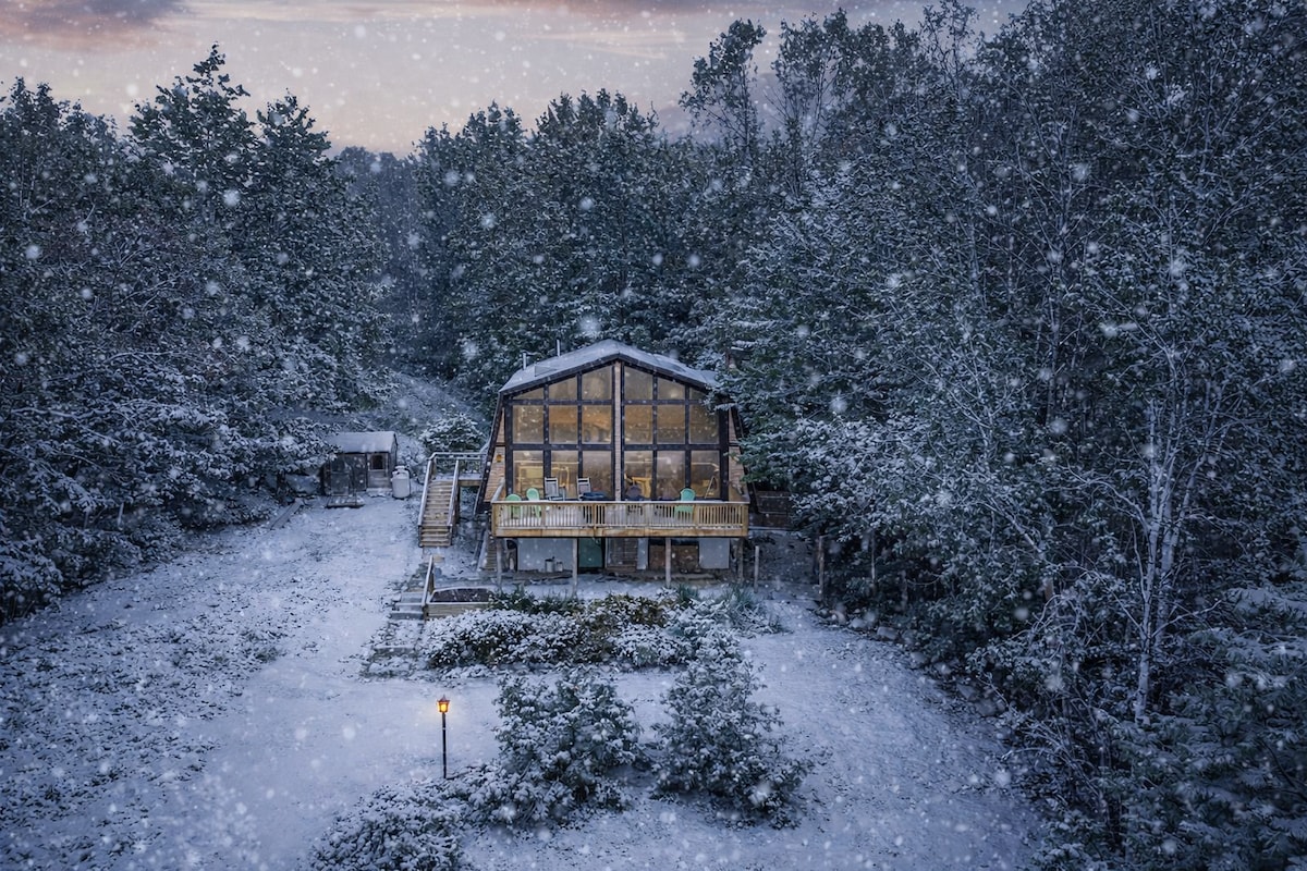 Išskirtiniai namai, įkvėpti jurtos su spiraliniais laiptais, jaukiu pagrindiniu miegamuoju, kaimiškos temos vonios kambariu, medine virykle ir modernia virtuve su nerūdijančiais prietaisais. sezonas25x45 čiuožykla, sūkurinė vonia, akmeninė laužavietė, privatus paplūdimys, didelė terasa ir centrinis oro kondicionierius. Puiki vieta atostogoms su slidinėjimo keltuvais už 1 mylios, pėsčiųjų takais ir tokiais patogumais kaip Keurig, Instapot ir prie sienos tvirtinamas televizorius su transliacijos paslaugomis. Prieiga prie Moose Lodge ir trobelių su pasivaikščiojimais upe, žvejyba ir laukine gamta. Tikras atminties kūrėjas!