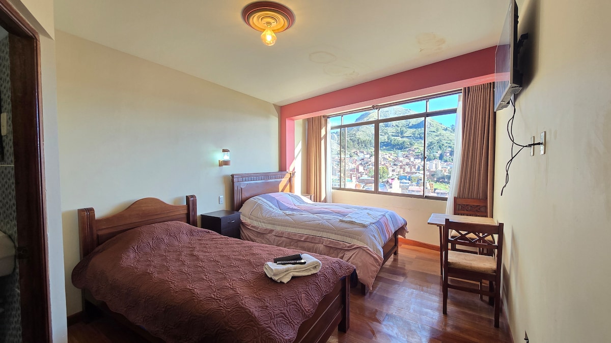 Mėgaukitės patogia ir jaukia viešnage šiame erdviame kambaryje, esančiame privilegijuotoje vietoje netoli pagrindinės aveniu 6 de Agosto ir įlaipinimo į Isla del Sol. 🛏️ Ką gali pasiūlyti kambarys: • Dvigulė lova • Viduržemio jūros pakrantės įkvėptas ranka dažytas sienų dekoras • Gyvenamoji erdvė su apvaliu stalu darbui • Atskira vonia ir televizoriaus kabelis • Šildymas šaltam klimatui • Elektrinį virdulį 📍 Įsikūręs viešbutyje Lago Azul. Rezervuokite dabar!