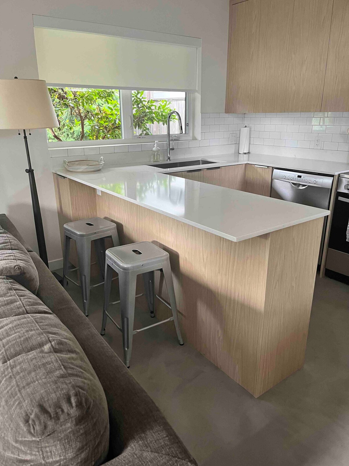 This private, open plan suite was created from Jen's former yoga studio within our family home, reusing and repurposing materials wherever possible. Warm reclaimed hardwood floors leads to a deck at the edge of the Princess Park forest, with a salmon creek running to the west. Wildlife often passes through — raccoons, owls, and occasionally even a bear. Some of the North Shore’s best mountain biking is just a block away. A quiet, unique retreat designed for rest, privacy, and nature.