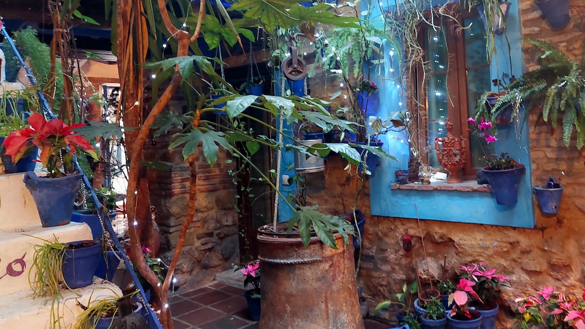 Donde las escaleras recitan versos!!! Alojamiento independiente con terraza en casa patio, muy pintoresca y alegre. Lugar lleno de vida que transmite muy buena energía. Patio colorido, con brocal de pozo árabe y columna romana Oasis de frescor en verano. Ideal para artistas y músicos Posibilidad de uso del patio para eventos culturales, y opción de recibir clases de hand. Ambas cosas tendrán un coste adicional. Nuestro patio y escalera ha sido escenario en vídeos del Barrio o de Mario Díaz.